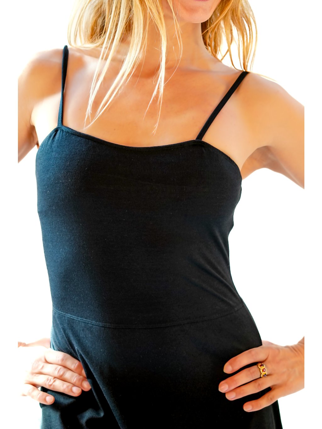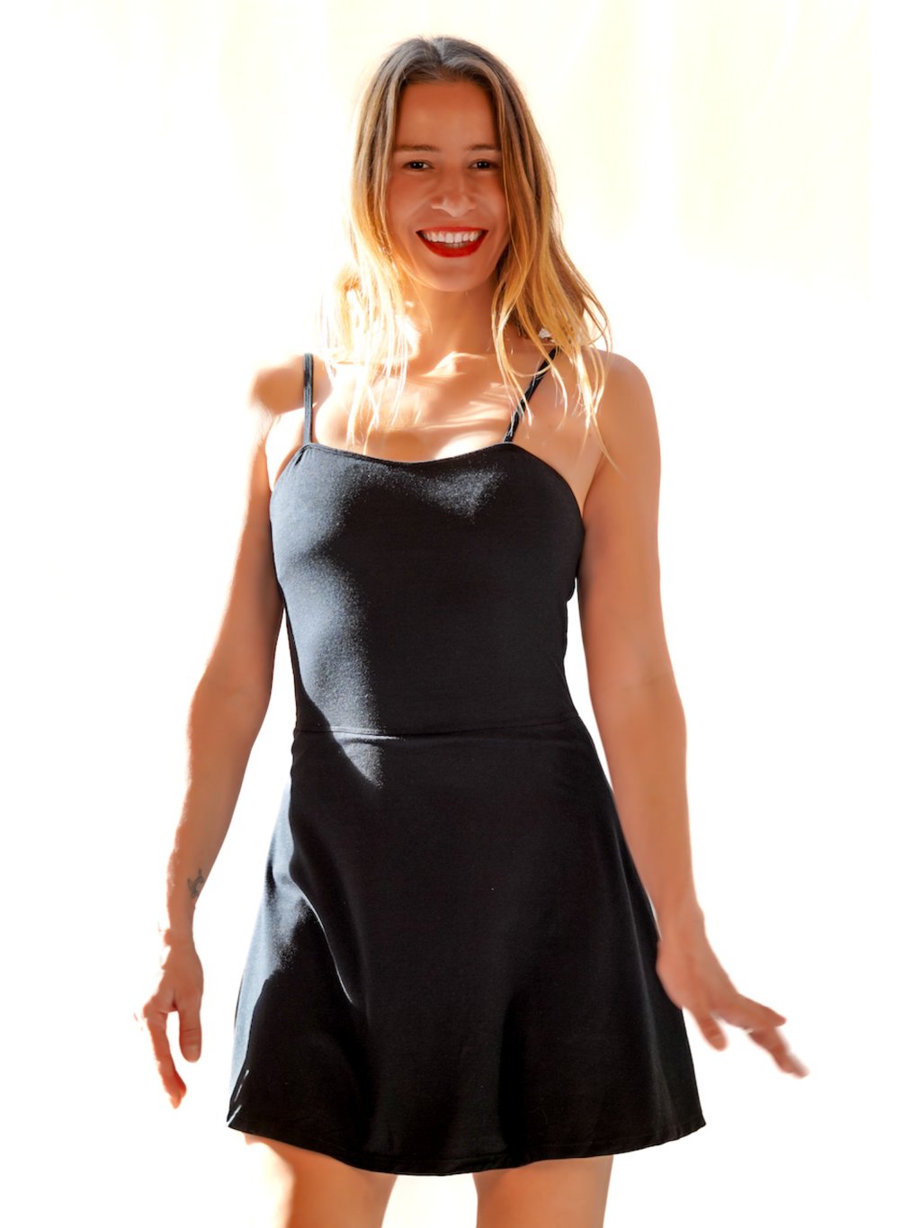 Bambusové minimalistické šaty se všitými kraťásky a podprsenkou jsou úchvatné. V černém provedení působí sofistikovaně a elegantně. Vytváří efekt přesýpacích hodin. Jsou 100% funkční a nádherně ženské zároveň.
