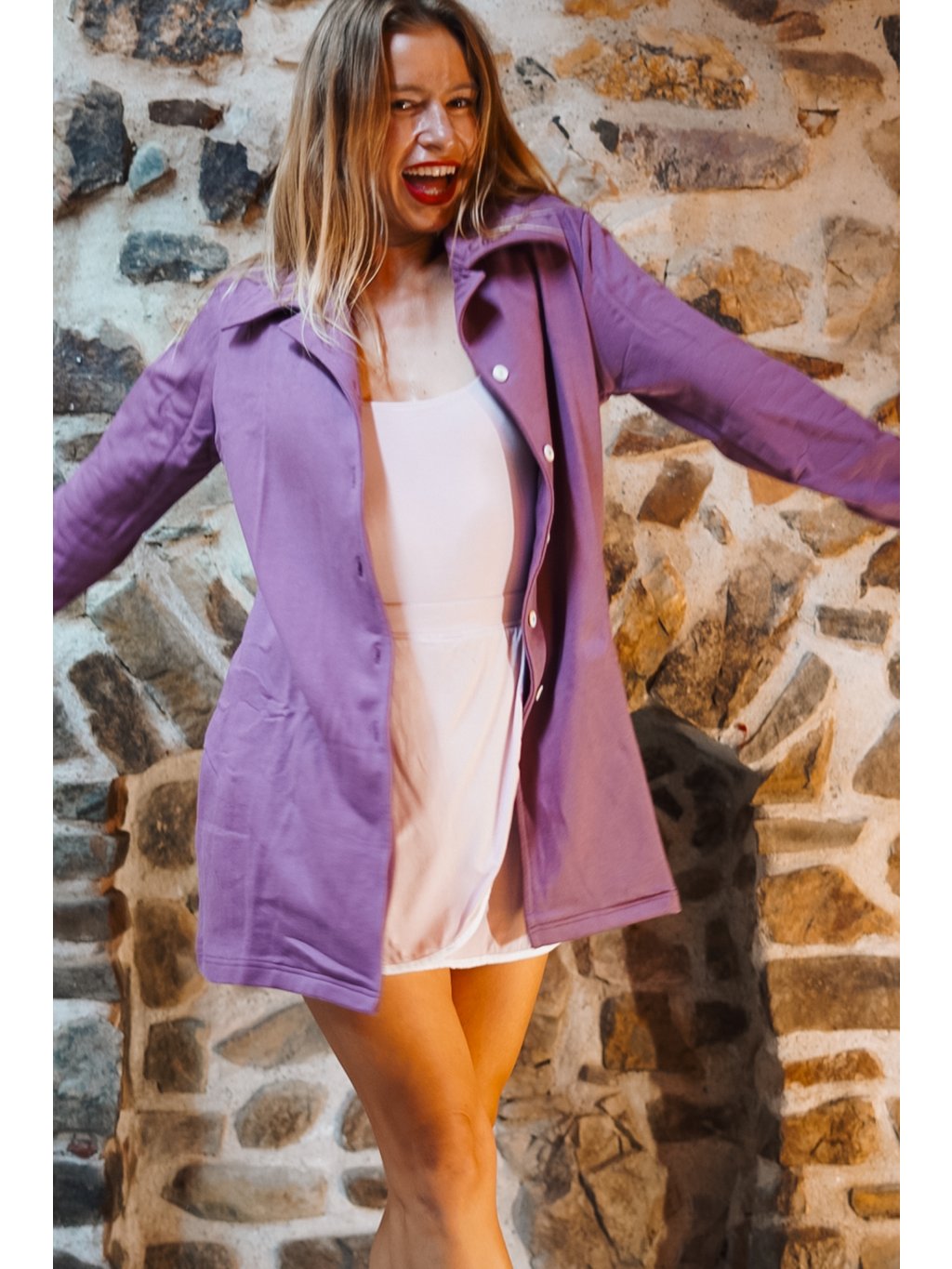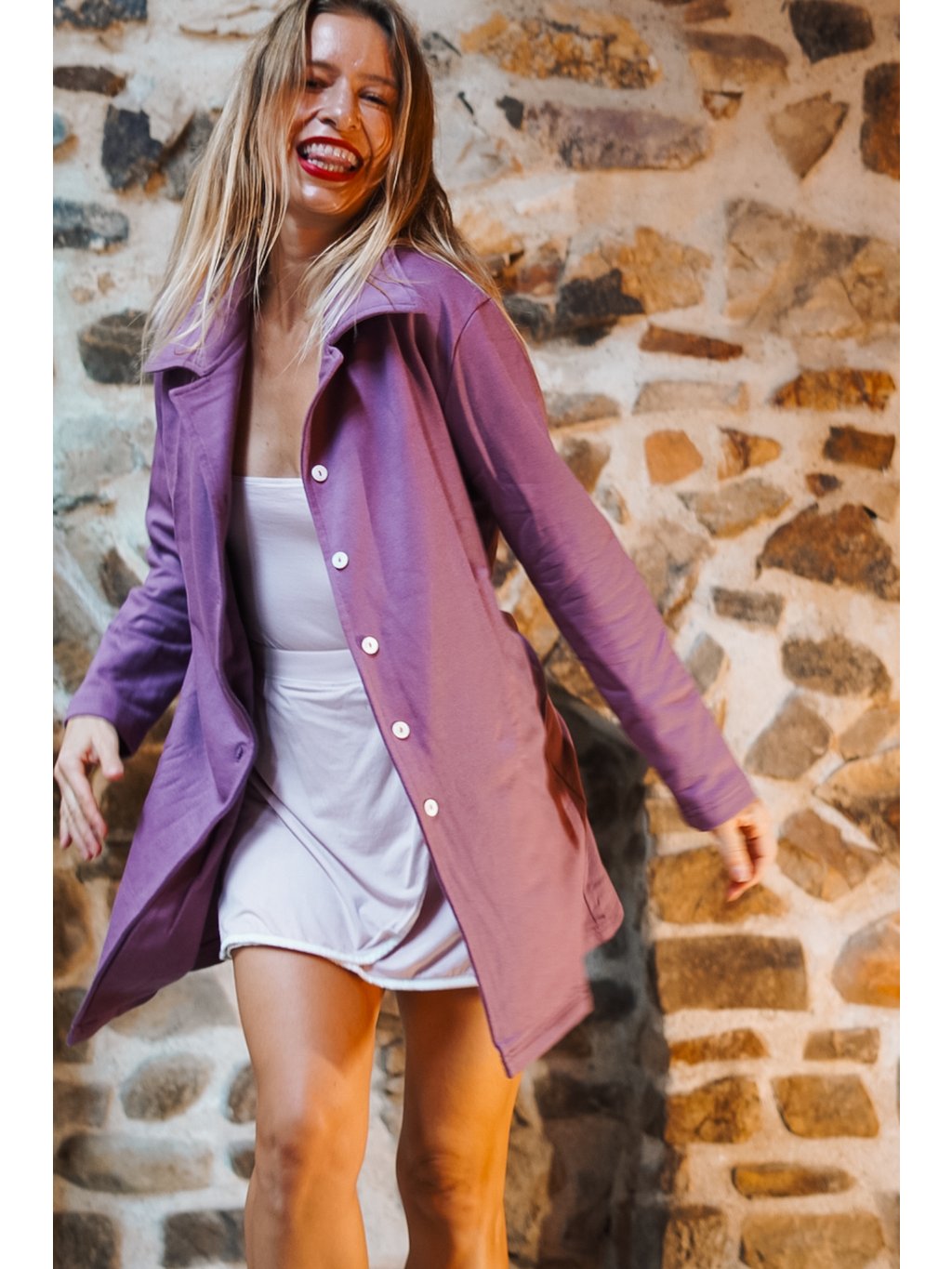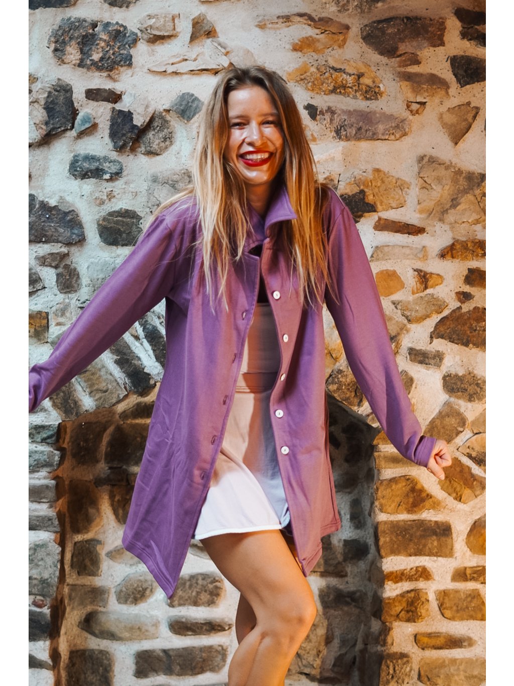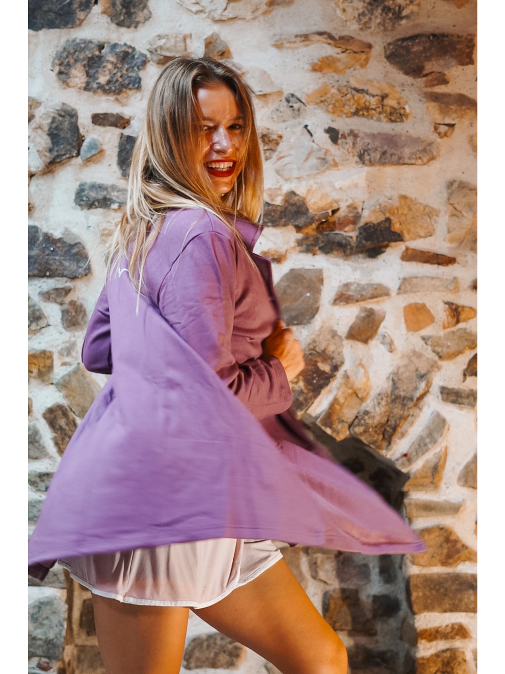 Náš bavlnáček měkce fialový, šeříkový je přenádherný. Ta barva je tak hladící, uklidňující a vyživující. Vem si kabátek na jógovou lekci nebo na procházku a uvidíš, jak na Tebe bude působit zachumlaně a elegantně zároveň. Je to náš absolutní miláček!