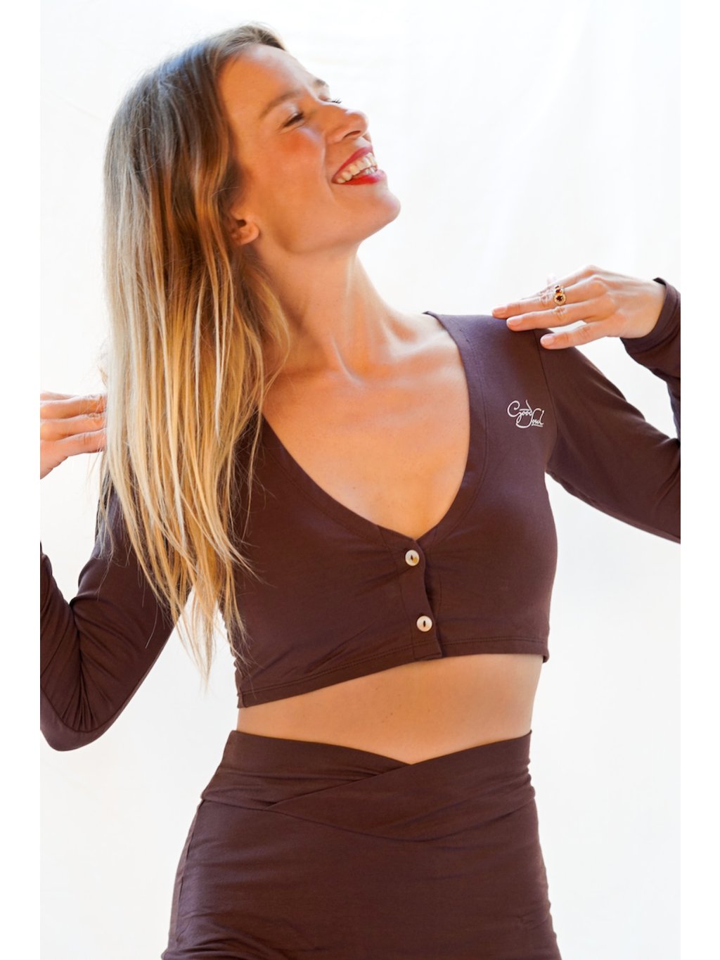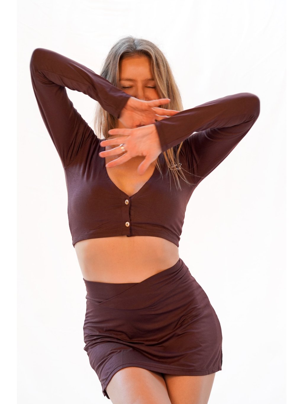Tak si to vyzkoušej, vypadat jako čokoládu "v shapu". To chceme :-). Kombinujeme délku rukávu s minimalismem topu. Efekt je wow! Nejvíce se tento top hodí k čemukoliv, co budete mít až do pasu = plandavé tepláky a nebo naši úchvatnou jógovou sukni ve stejné barvě! Na tanec a řádení v lese ideální!