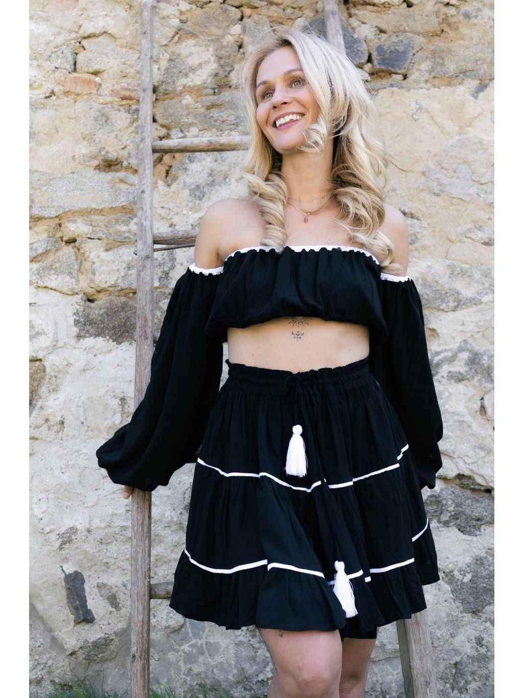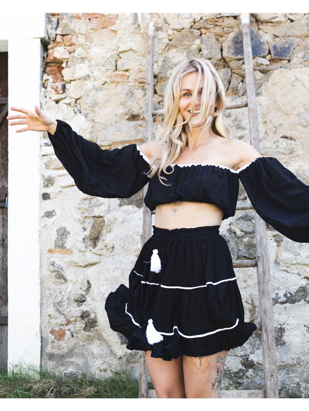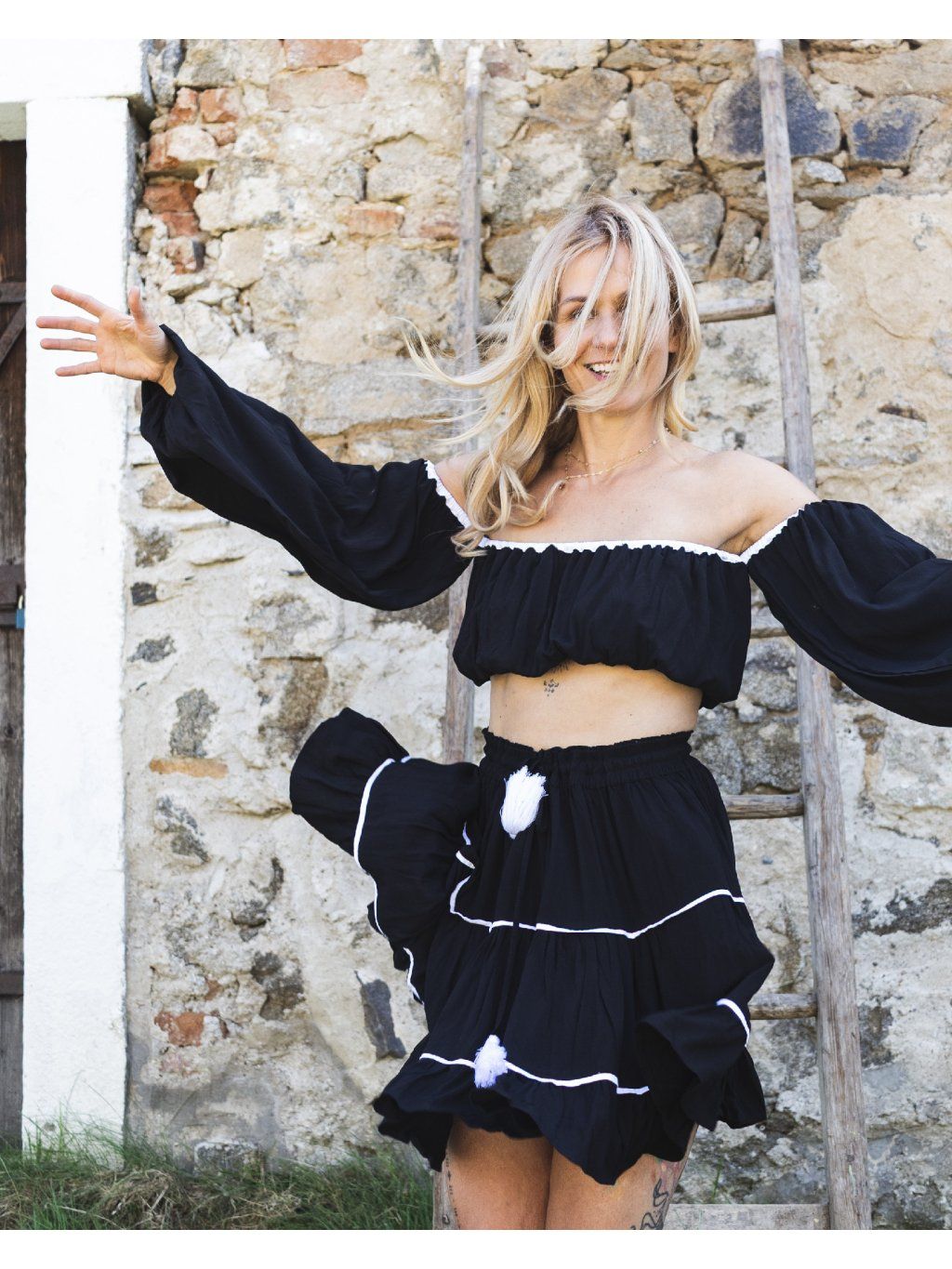 Sukně je vrstvená do měkkých, živých linií, které při každém kroku vytváří jemný pohyb. Přirozeně přitažlivý. Černá je zde hluboká. Dva bílé pruhy ji prosvětlují jako tah štětce na tmavém plátně.