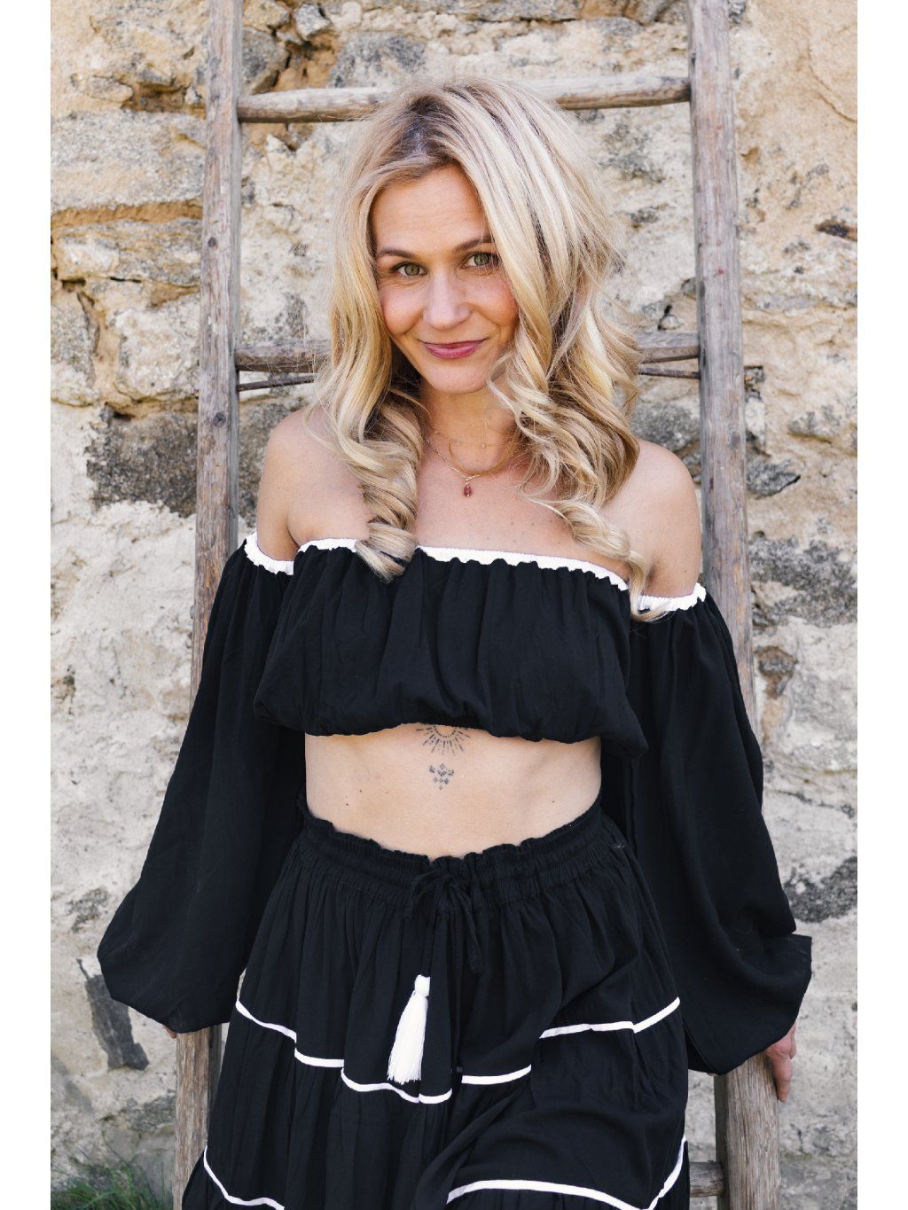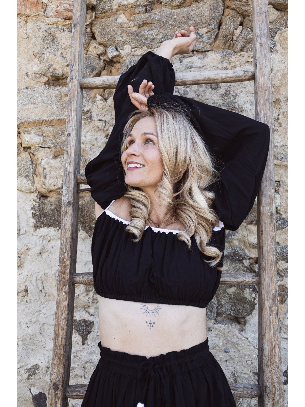 A pak přichází TEN top. Zakryje jen to podstatné a zbytek nechá dýchat. Ramena zůstávají zcela odkrytá, zatímco rukávy žijí vlastním životem. Jsou objemné, nadýchané, zachycené jemně pod ramenem a stažené u zápěstí. Vzniká kontrast mezi odhalením a strukturou. Mezi jemností a výrazem. Celek působí jako letní scéna z jihu Itálie – trochu divoká, trochu něžná, plná života. A velmi magneticky přitažlivá.