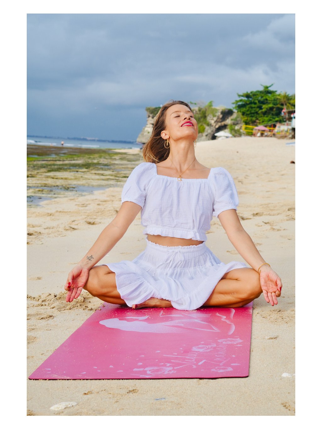 Vysokovibrační jógová podložka SLEDUJ ZNAMENÍ v jemně růžovém provedení. Chtěli jsme v Tobě podpořit důvěru v neviditelné. V onen šepot, který Tě volá, abys šla za svými dětskými sny. Její design reflektuje nejvyšší vyladění komunikace s neviditelným. Je absolutně protiskluzová, aby ses na svou podložku mohla spolehnout a opřít se o ni.