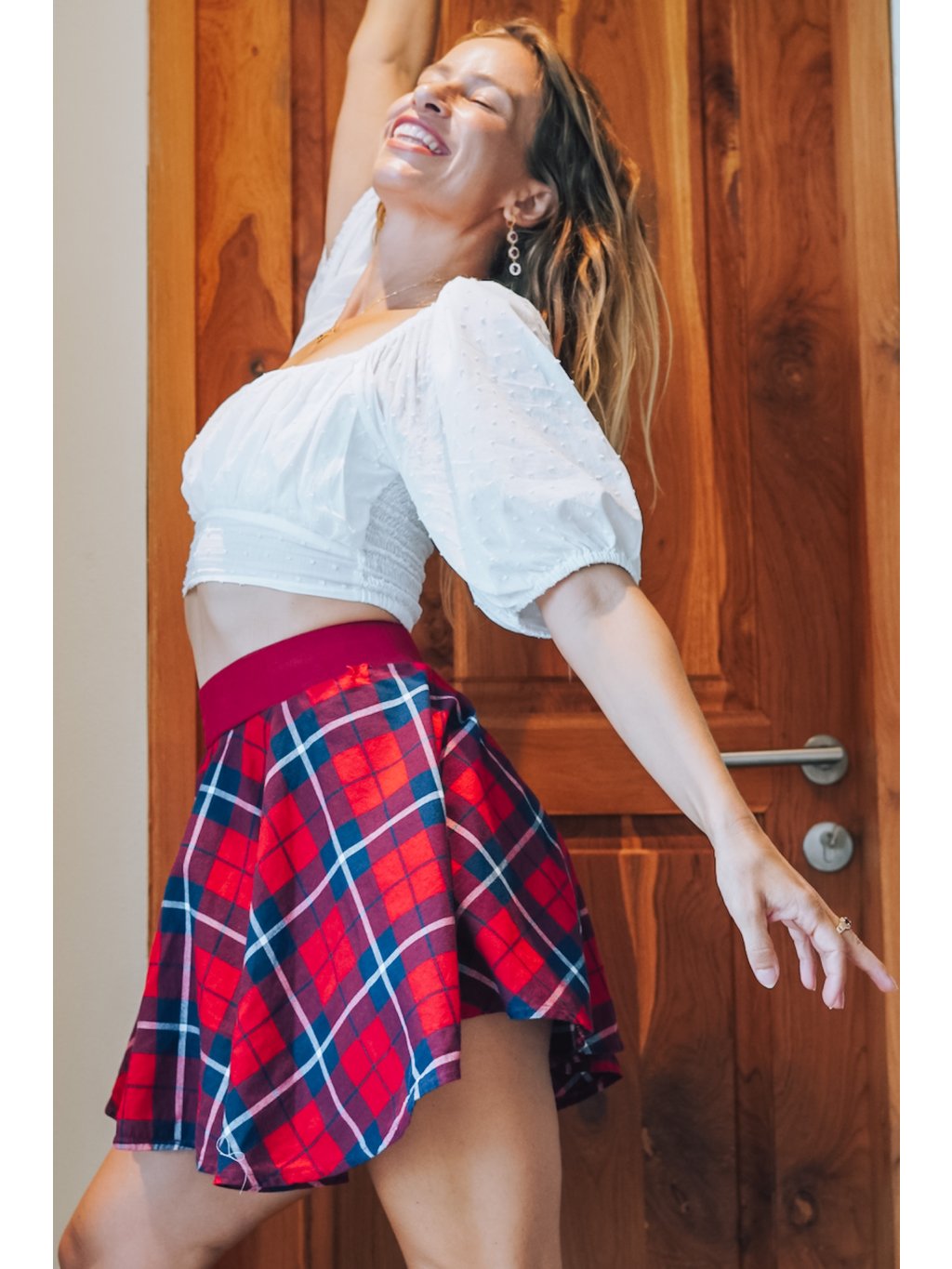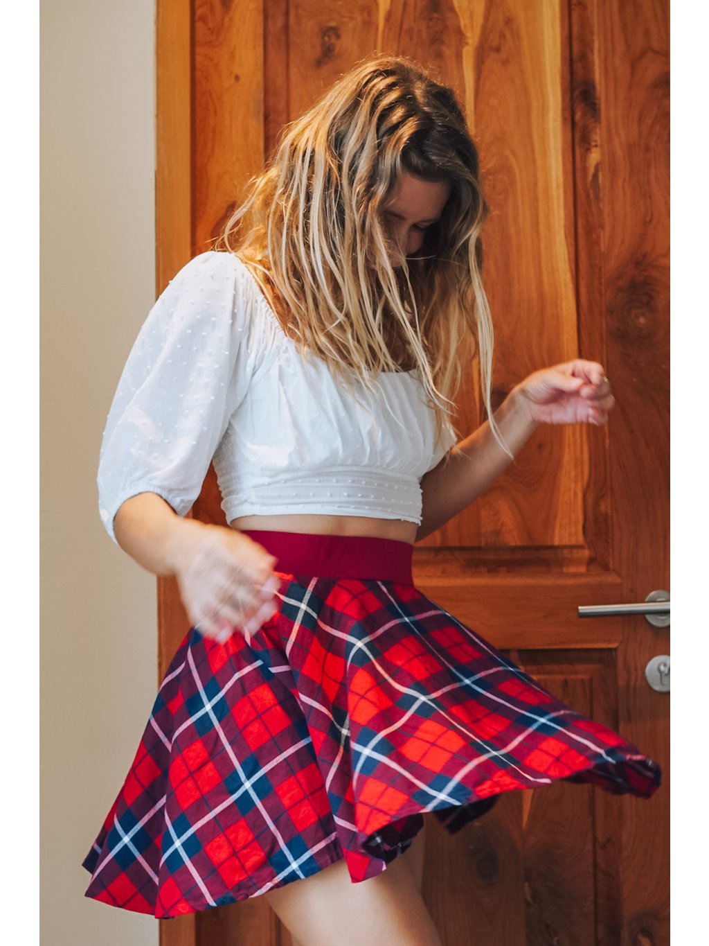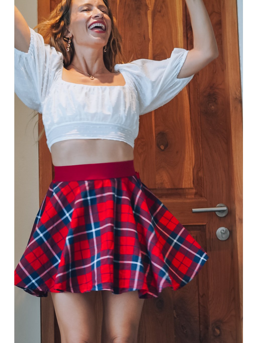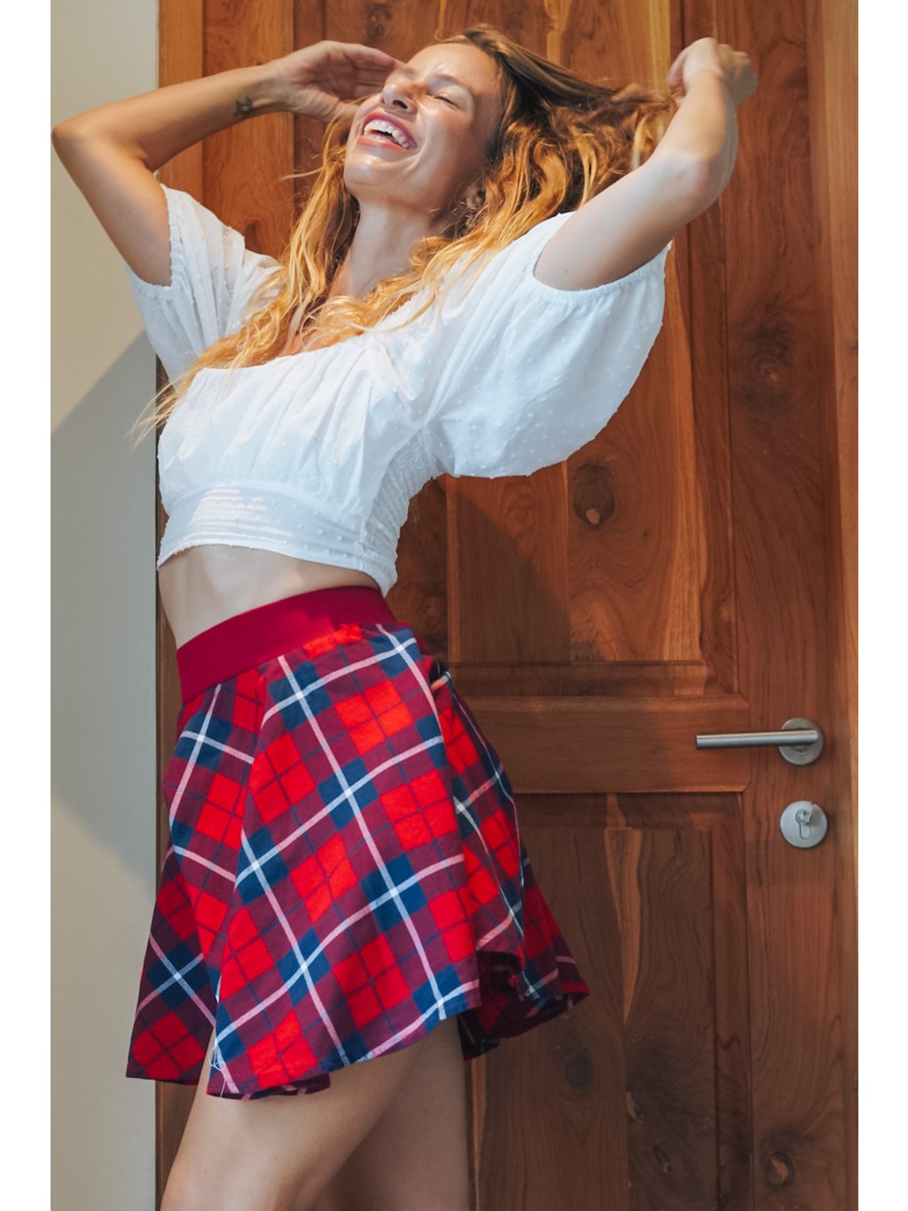 100% bavlněný flanel se skotským stylem a uvnitř kraťásky z přírodní elastické viskózy = výsledek je neodolatelný! Můžeme se točit, skákat, dovádět, sukně může vlát a nic nebude vidět - jen naše krásně střižené kraťásky ve stejné barvě jako elastický pásek. Je to zkrátka geniální.