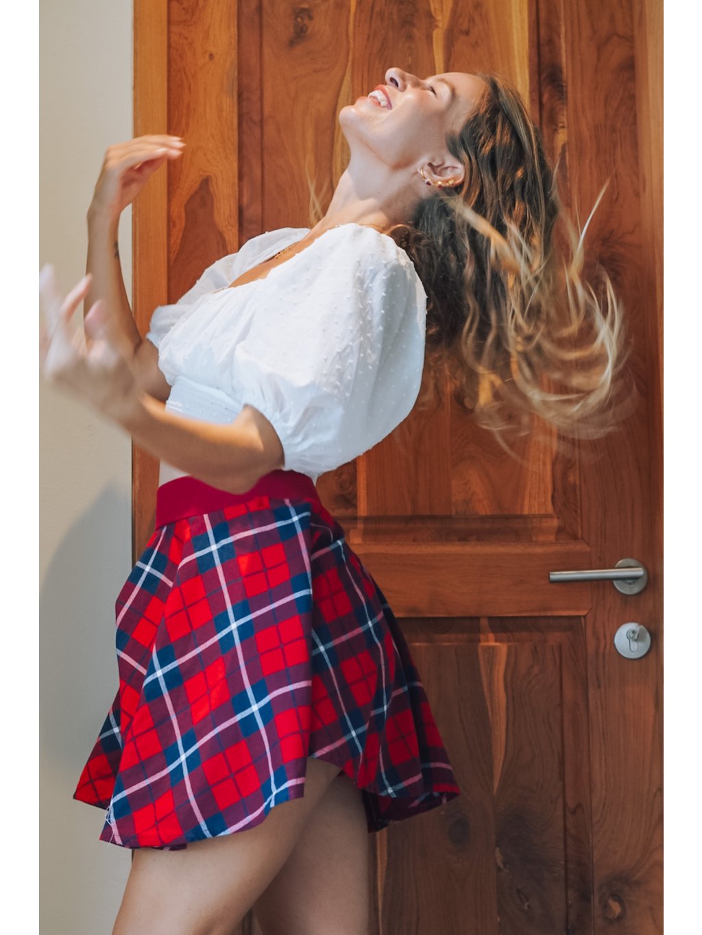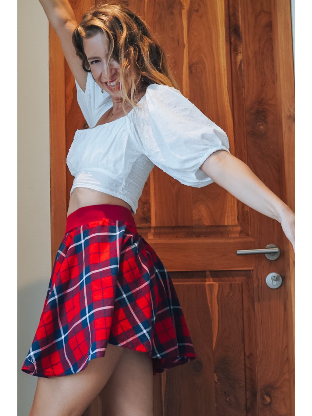 - Materiál: balijská viskóza nebo-li rayon, elastická varianta použita na kraťásky , vyrobena z dřevěné celulózy s přídavkem elastanu (7%) a sukně je vyrobena ze 100% bavlny z Bali, v provedení flanel, se skotským vzorem, je to wow!,