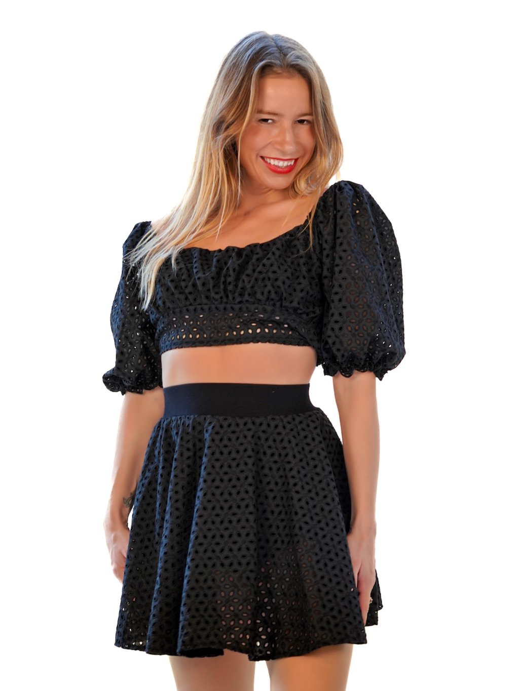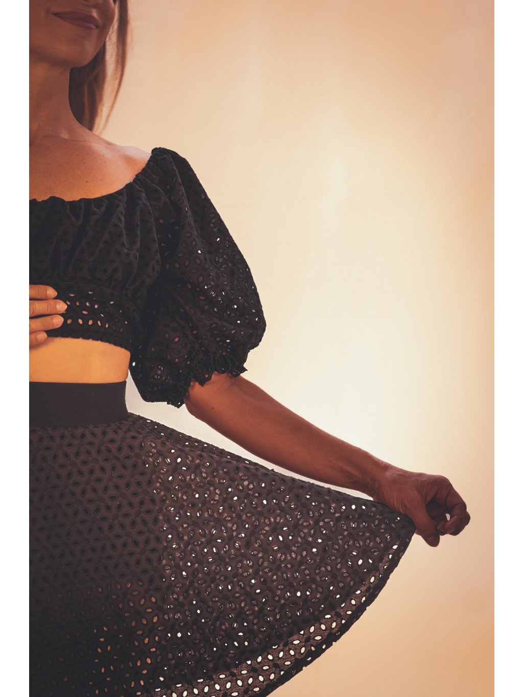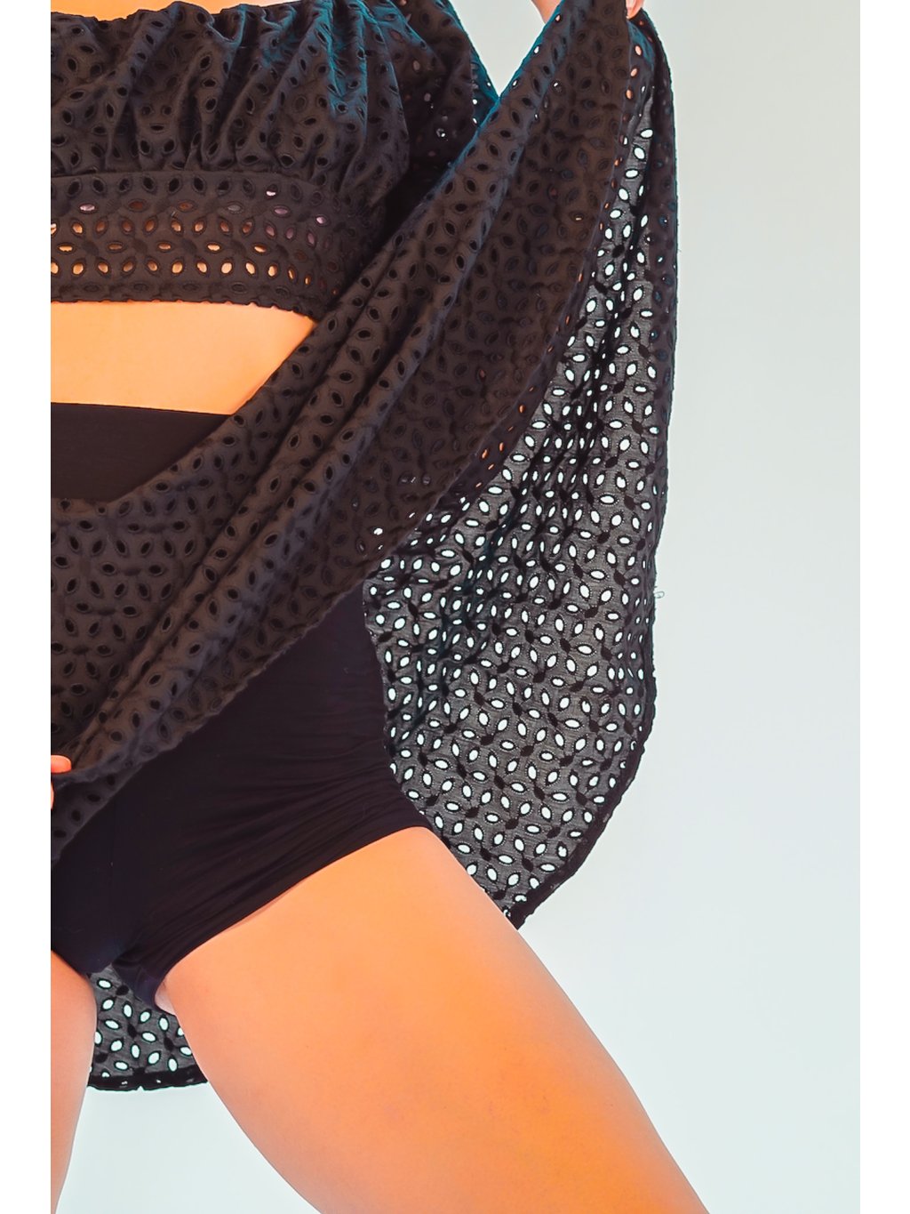 - Materiál: balijská viskóza nebo-li rayon, elastická varianta použita na kraťásky , vyrobena z dřevěné celulózy s přídavkem elastanu (7%) a sukně je vyrobena z černé krajky z bavlny.