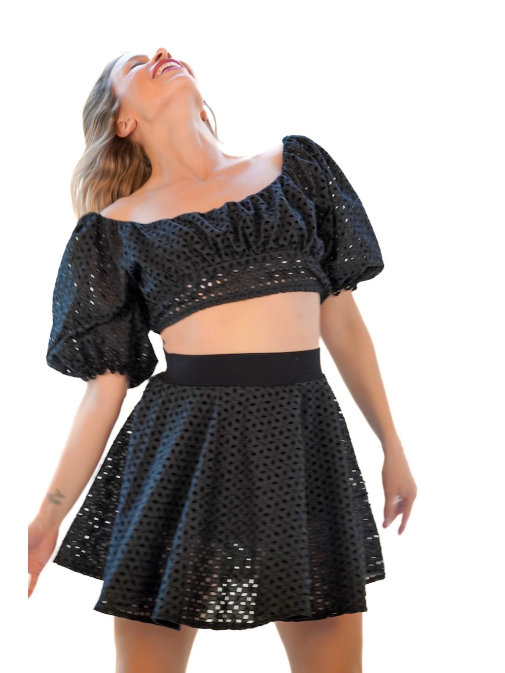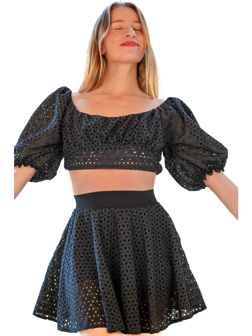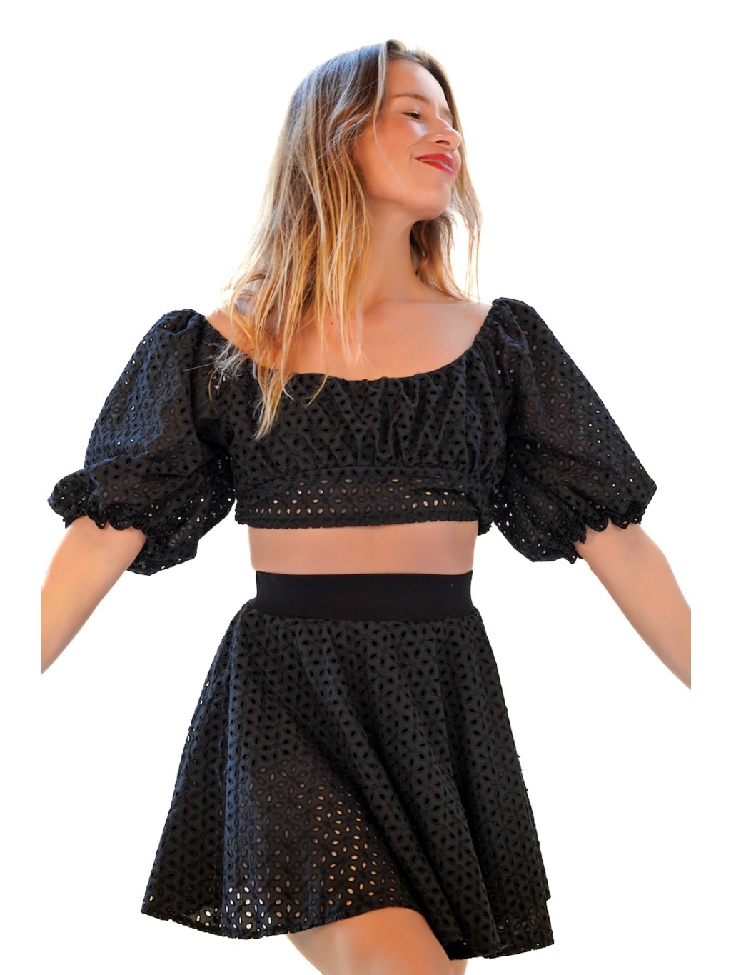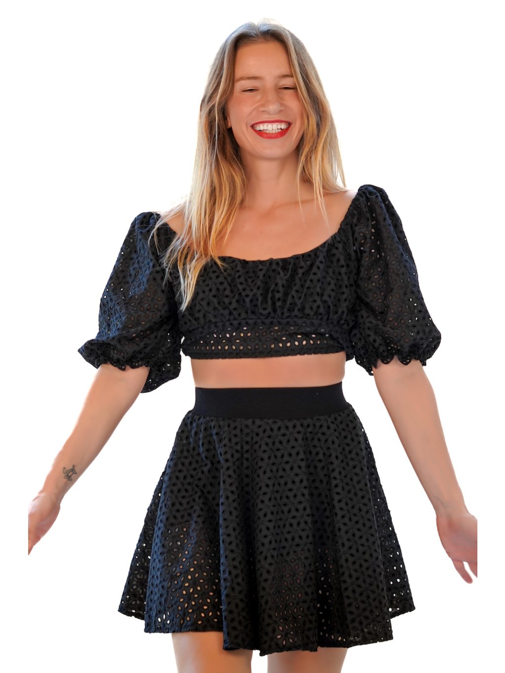 - Materiál: balijská viskóza nebo-li rayon, elastická varianta použita na kraťásky , vyrobena z dřevěné celulózy s přídavkem elastanu (7%) a sukně je vyrobena z černé krajky z bavlny.