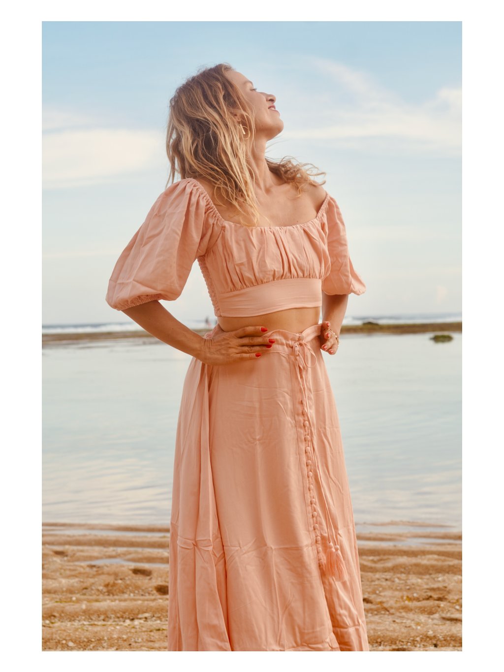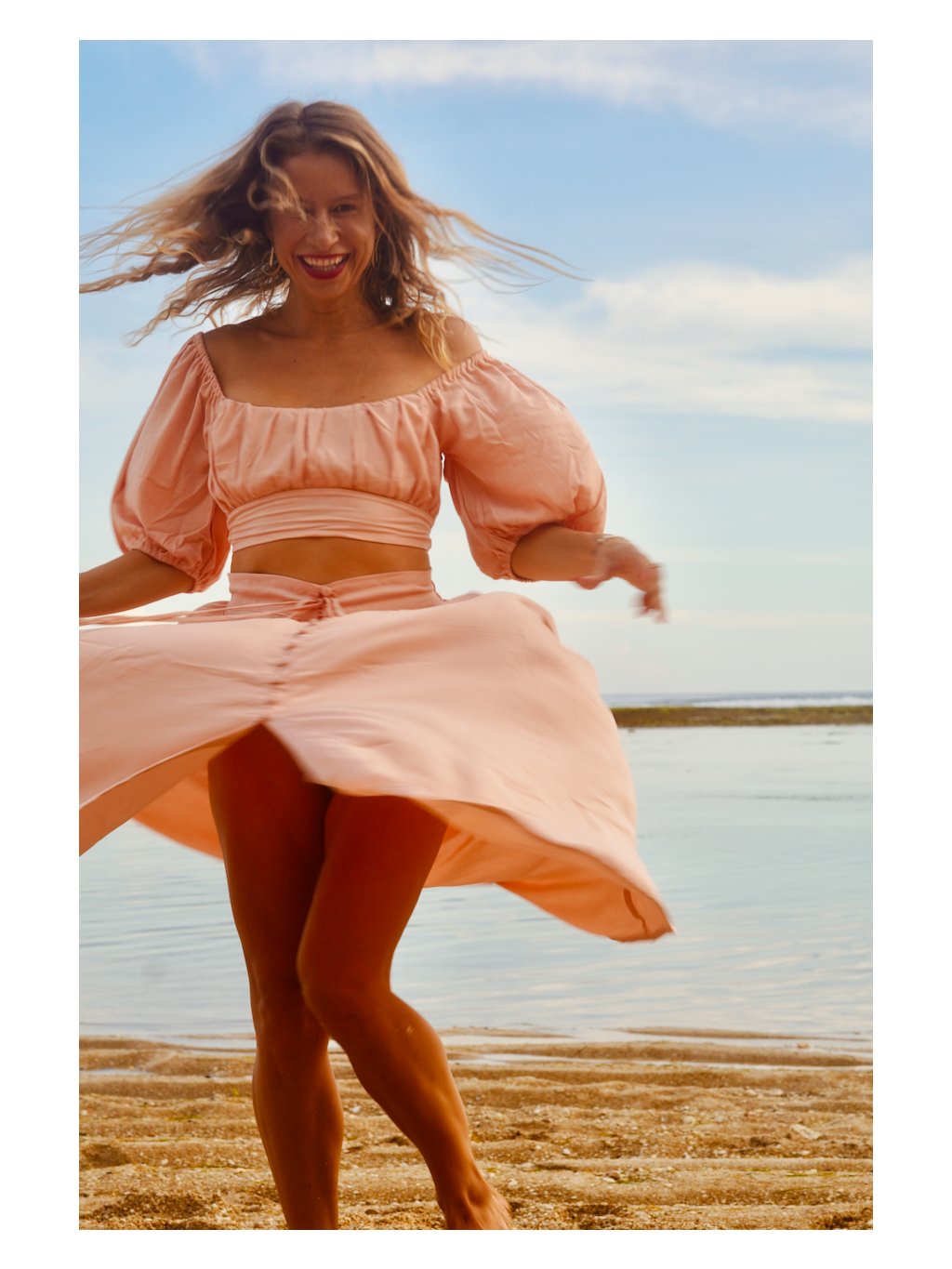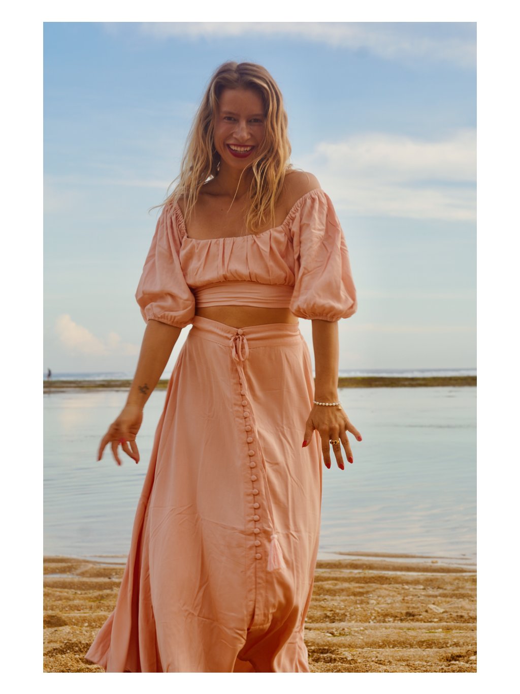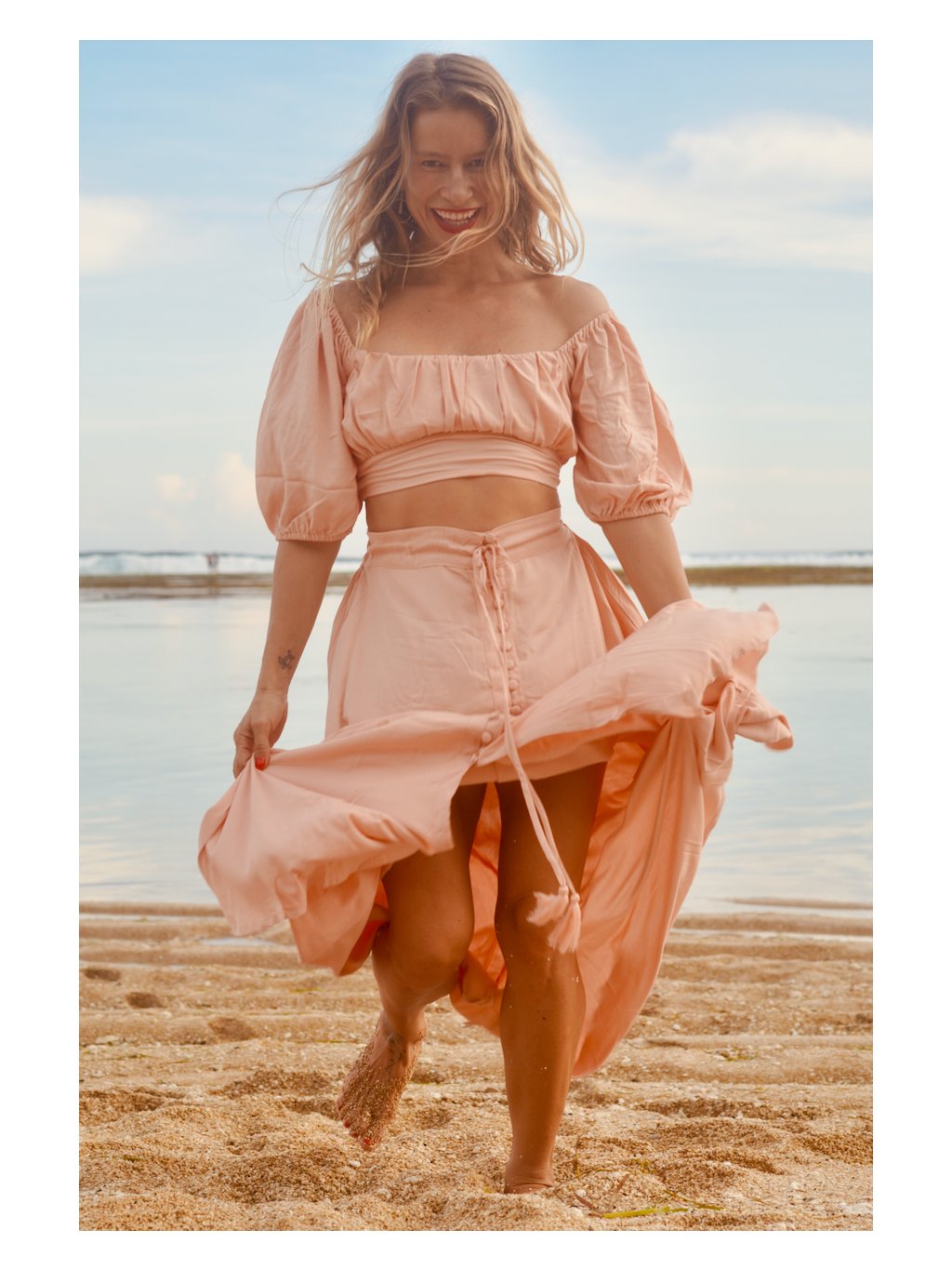 Meruňková záře jí dodávala pocit, že je zamilovaná do života a že dokáže cokoliv, protože jí život stojí za zády. Viskózová boho sukně z Bali.