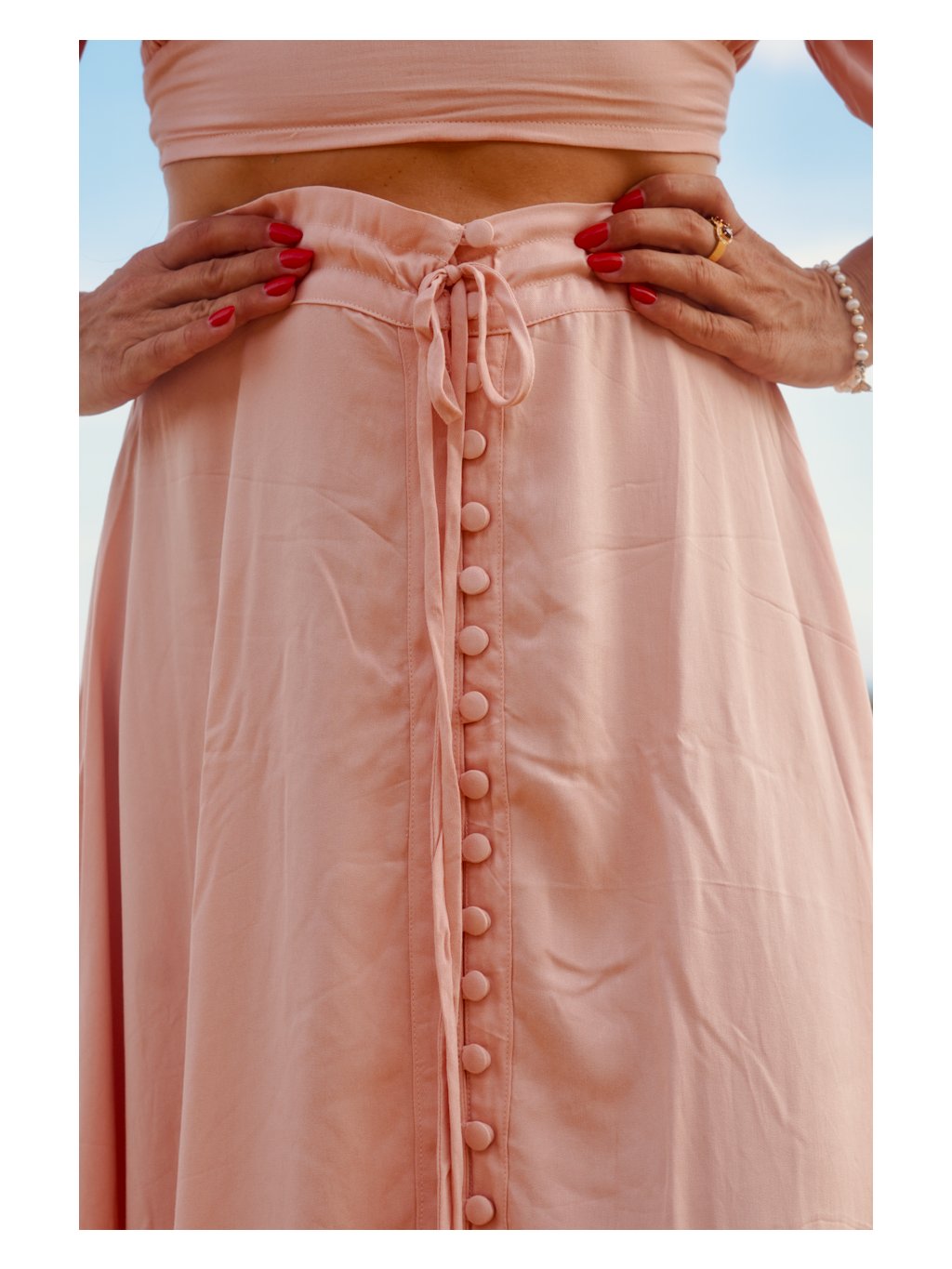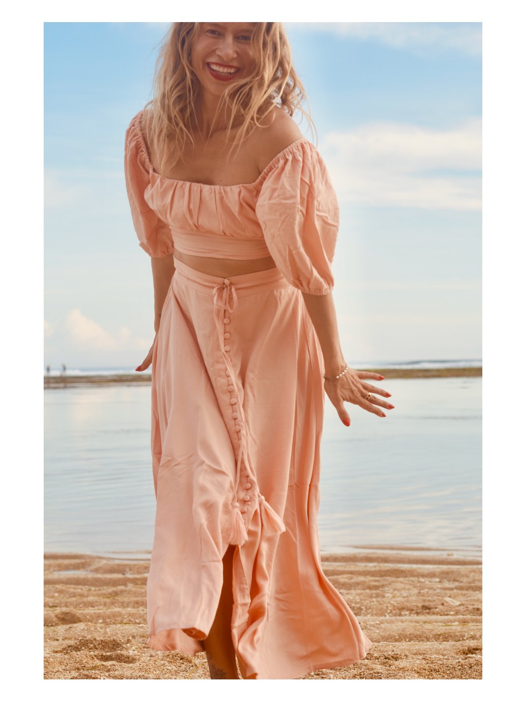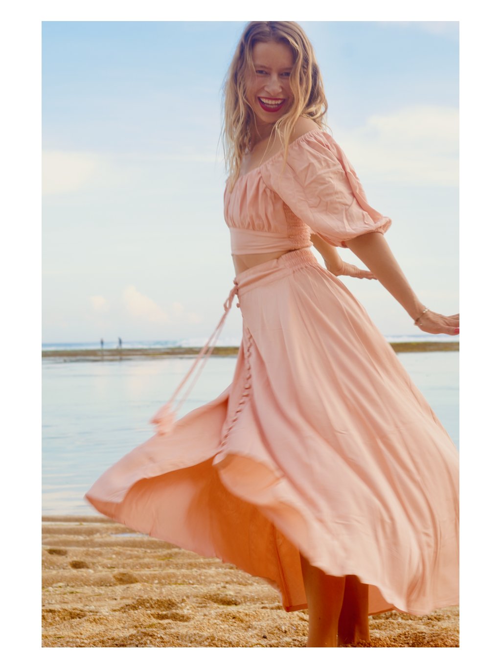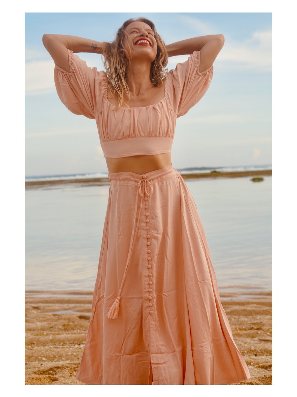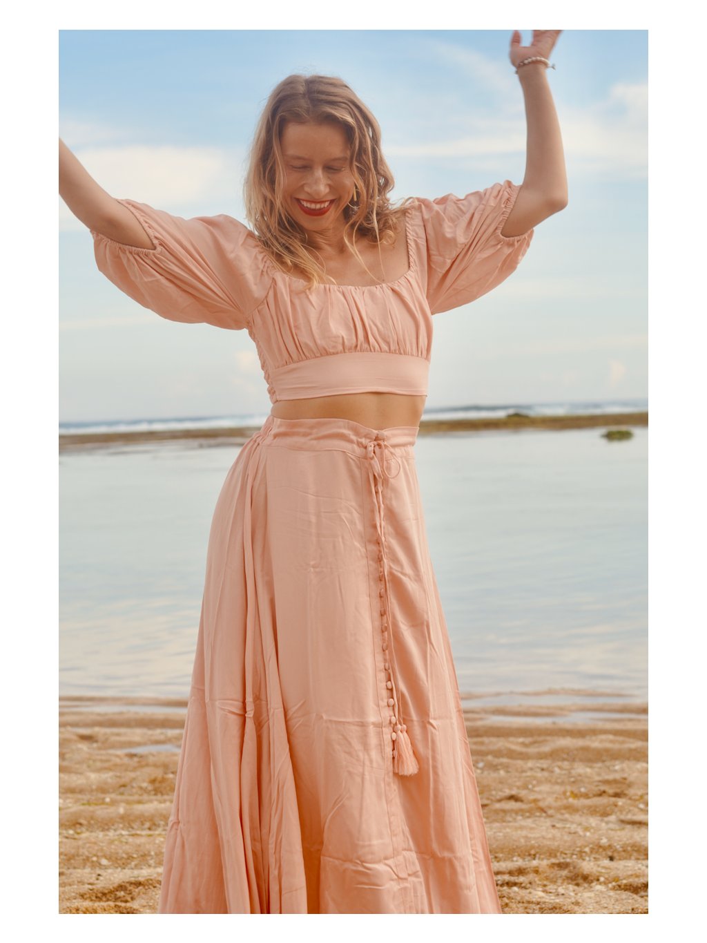 Meruňková záře jí dodávala pocit, že je zamilovaná do života a že dokáže cokoliv, protože jí život stojí za zády. Viskózová boho sukně z Bali.