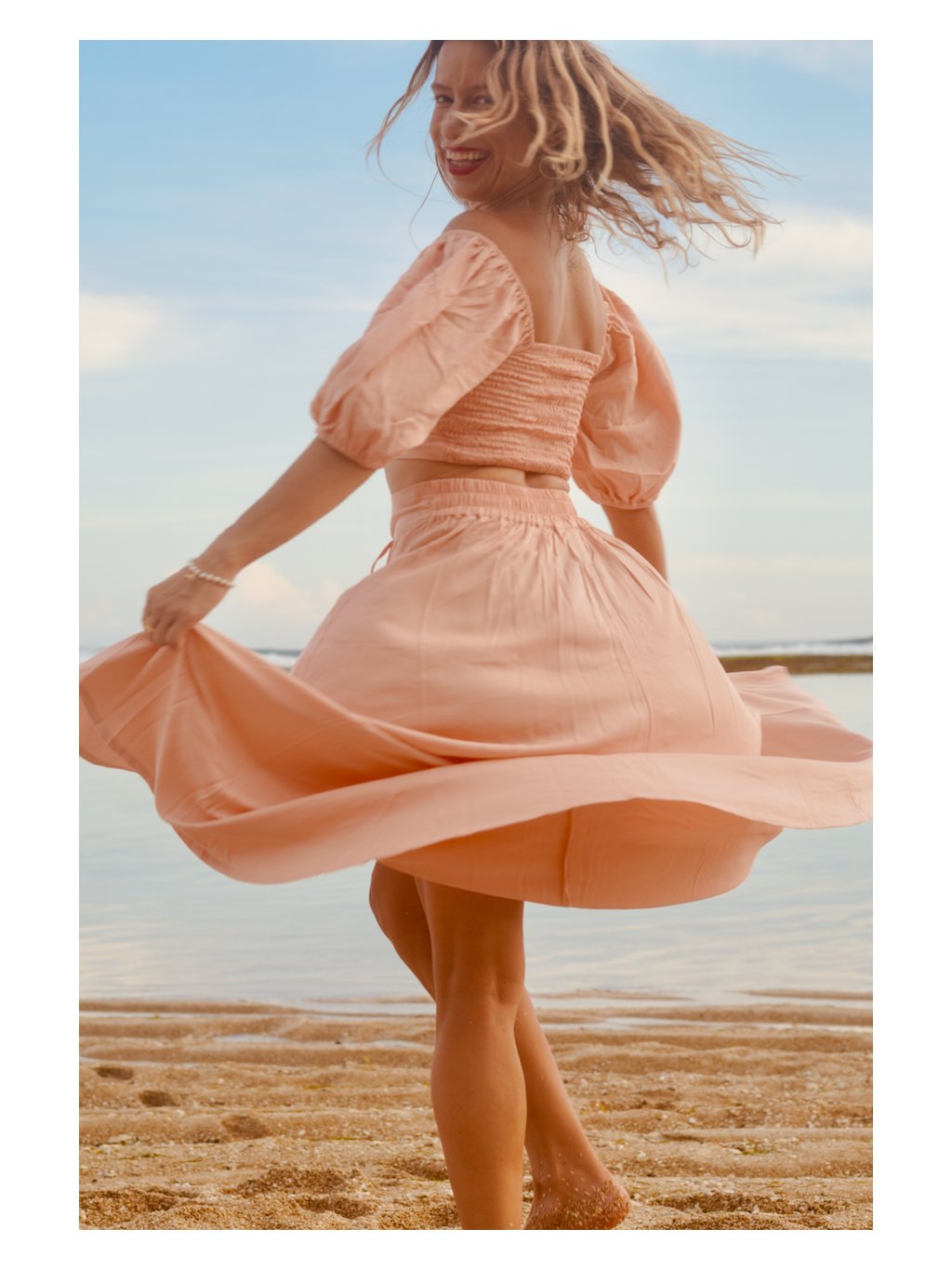 Meruňková záře jí dodávala pocit, že je zamilovaná do života a že dokáže cokoliv, protože jí život stojí za zády. Viskózová boho sukně z Bali.