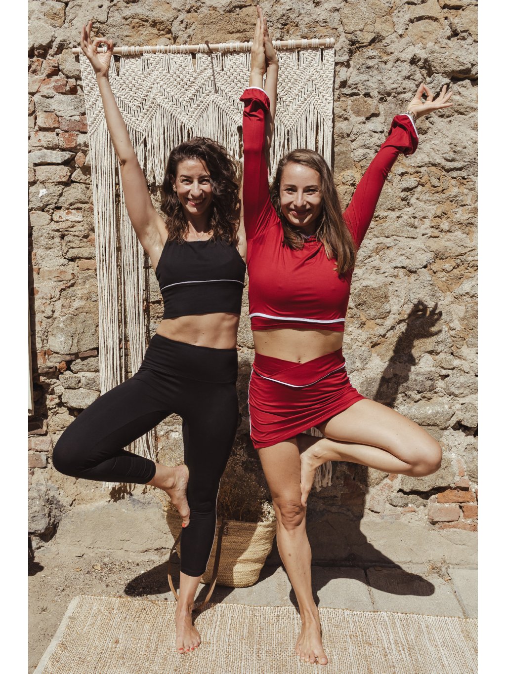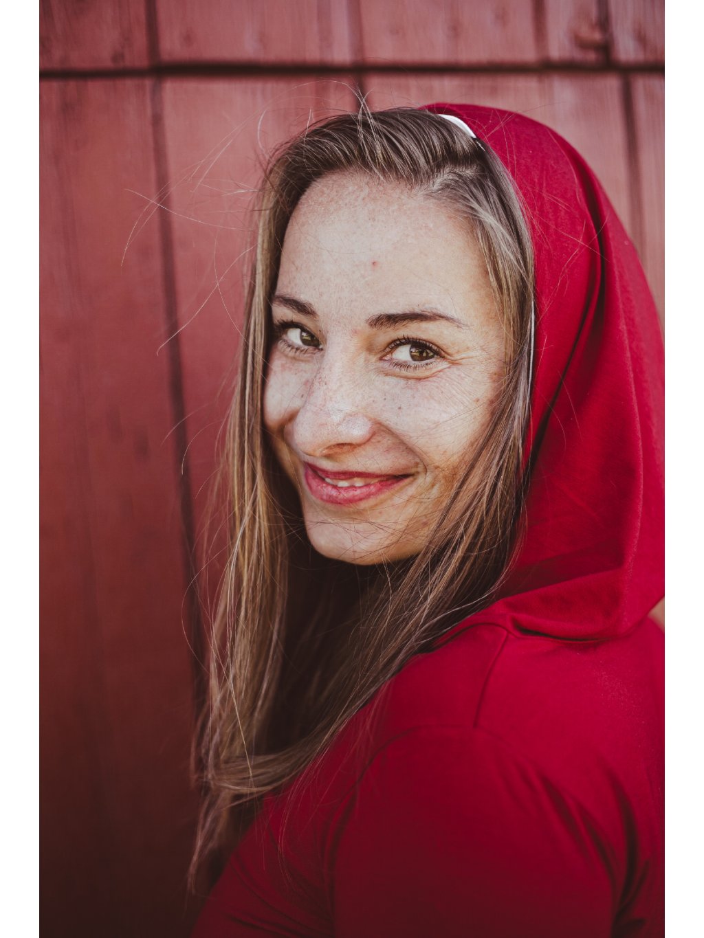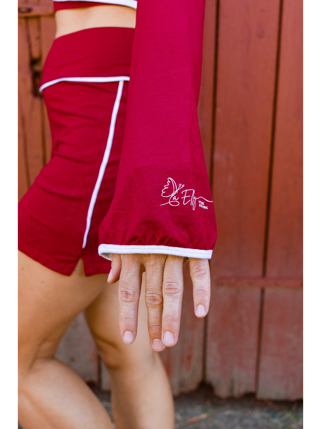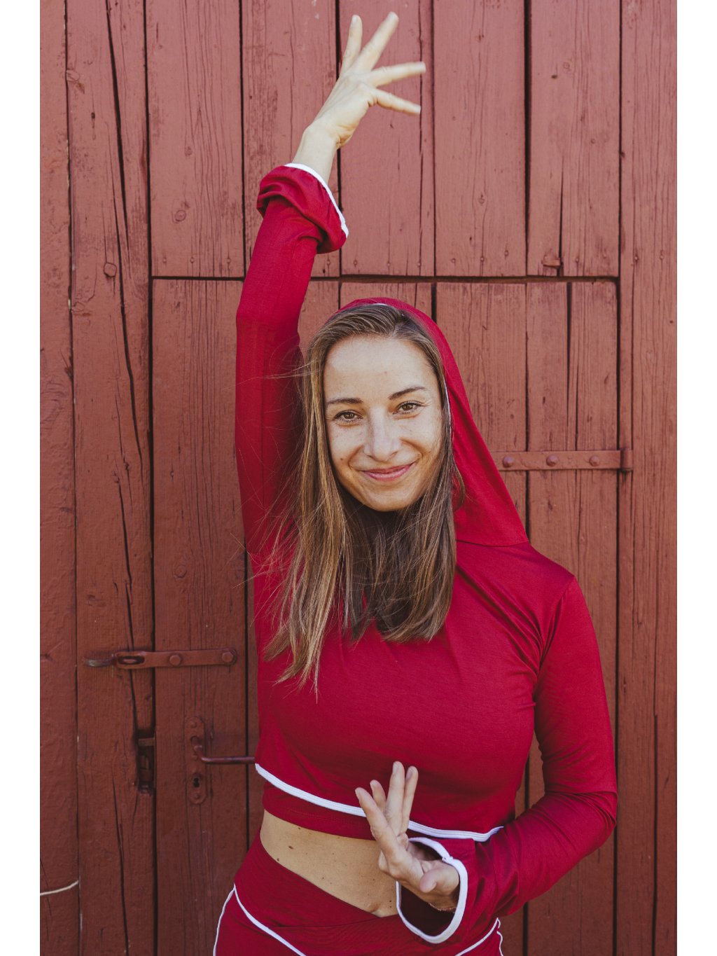 Nádherný červený top s dlouhým rukávem a kapucí. Je ušitý z lehkého, splývavého materiálu, který se příjemně přizpůsobí pohybu. Výstřih do „V“ s bílým lemem, který kontrastuje s červenou barvou látky. Stejné bílé lemování je i ve spodní části topu. Kapuce je jednoduchá, bez šňůrek, a dodává celému kousku sportovně-ležérní styl.