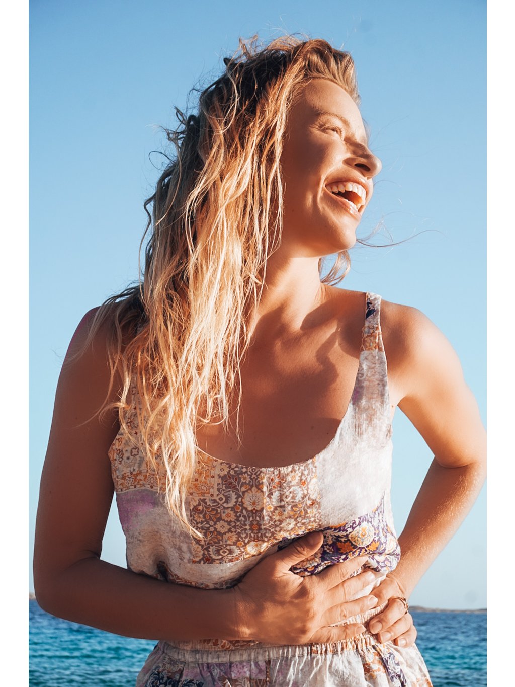 K širokým kalhotám přinášíme top ve stejném designu, ušitý z jemného tencelu (lyocellu), který hladí pokožku jako hedvábný vánek. Střih je dokonale ženský – top se zastrčí do kalhot a společně vytváří efekt postavy přesýpacích hodin, který přirozeně zvýrazní linii pasu a ladnost siluety.