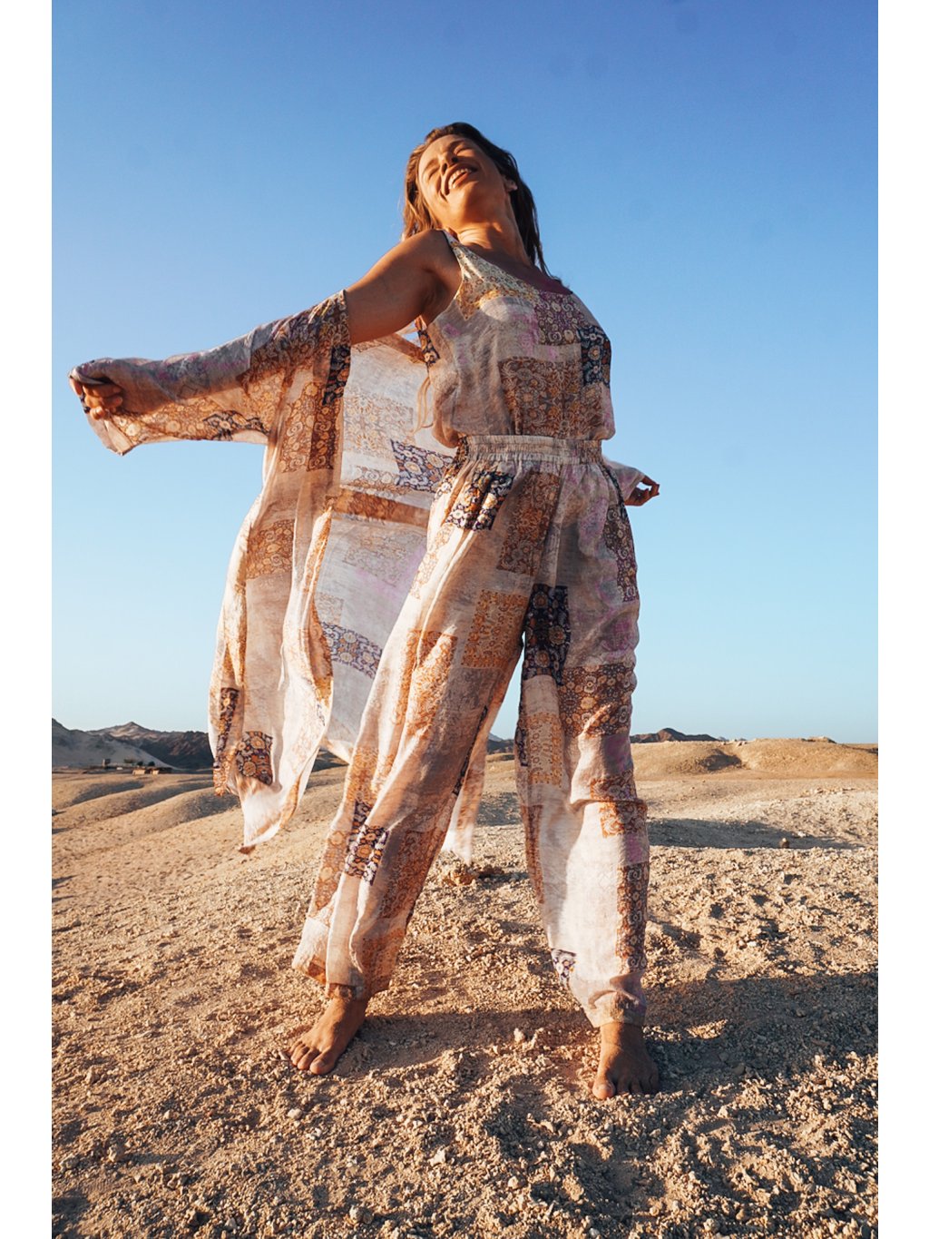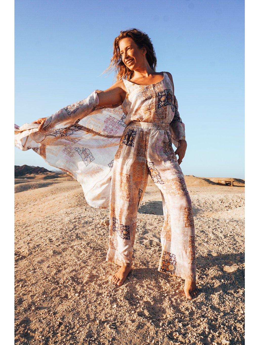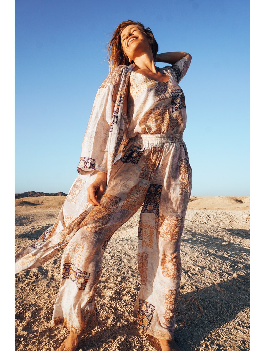 Tyto široké kalhoty z ultra lehkého přírodního materiálu jsou stvořené pro volnost, lehkost a ženský půvab. Splývají s tělem jako dech a s každým krokem se jemně vlní, jako by se jich dotýkal pouštní vánek.