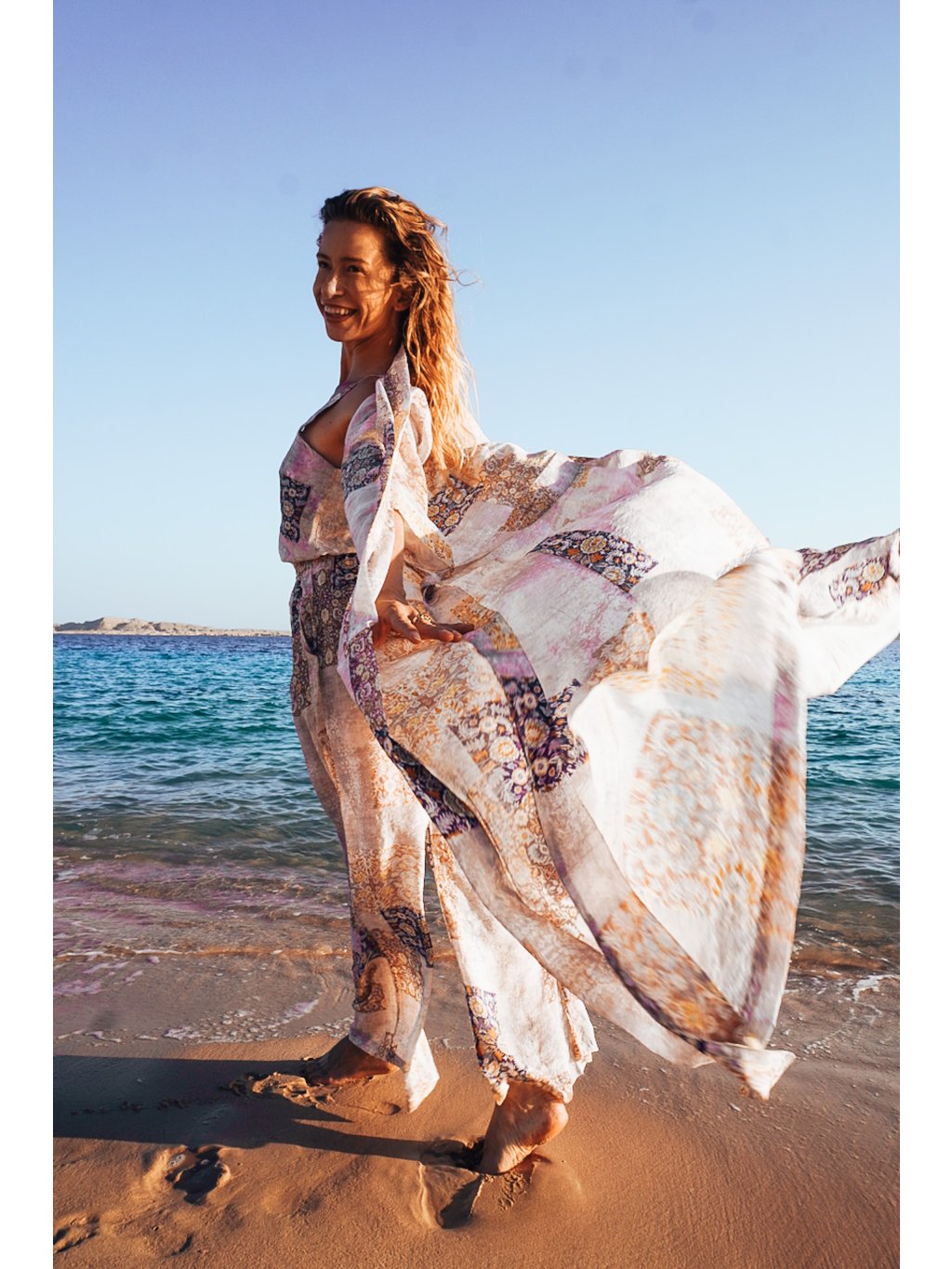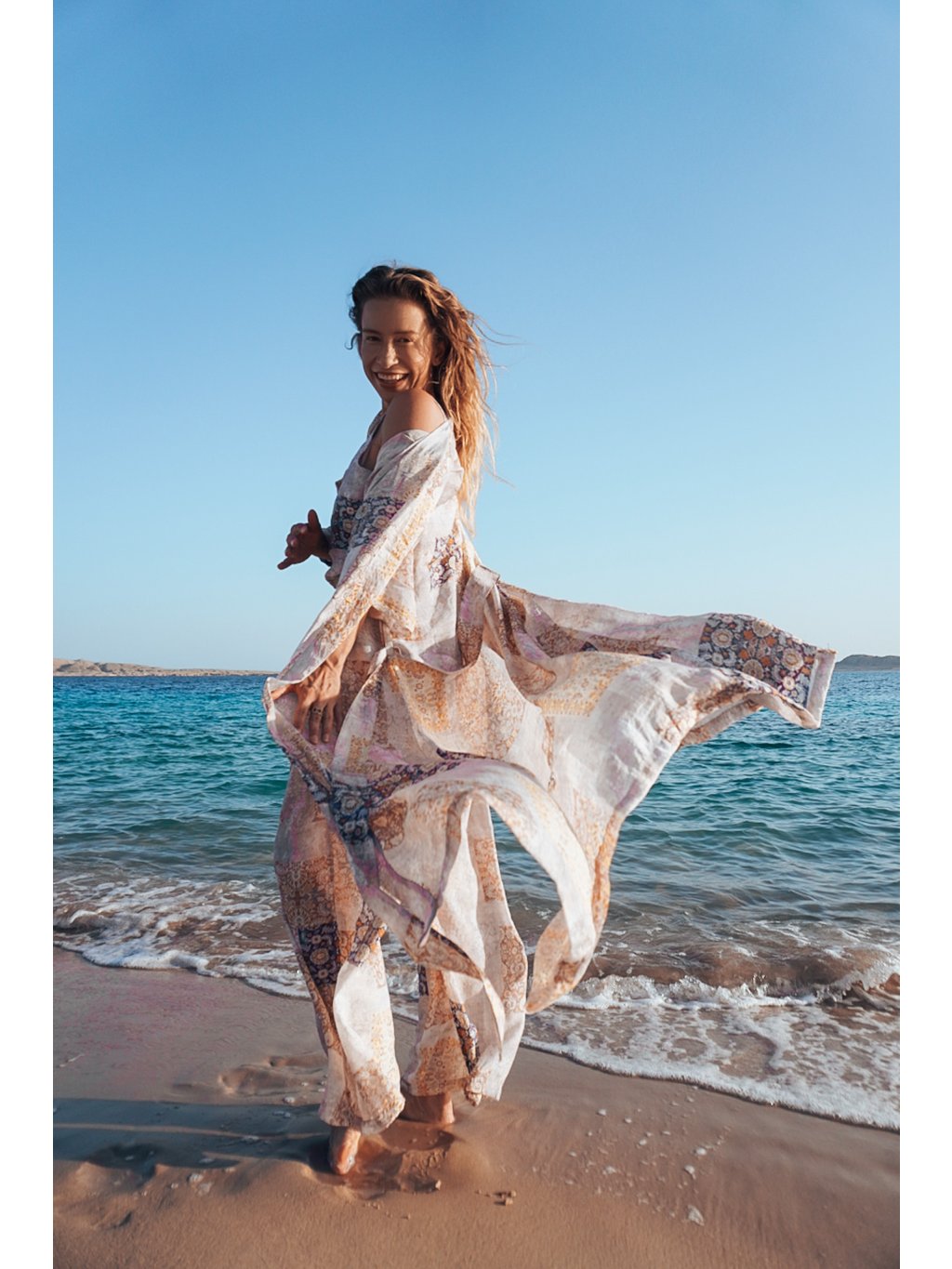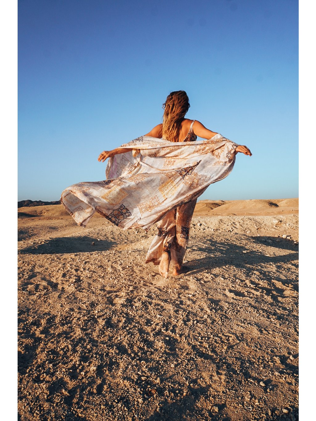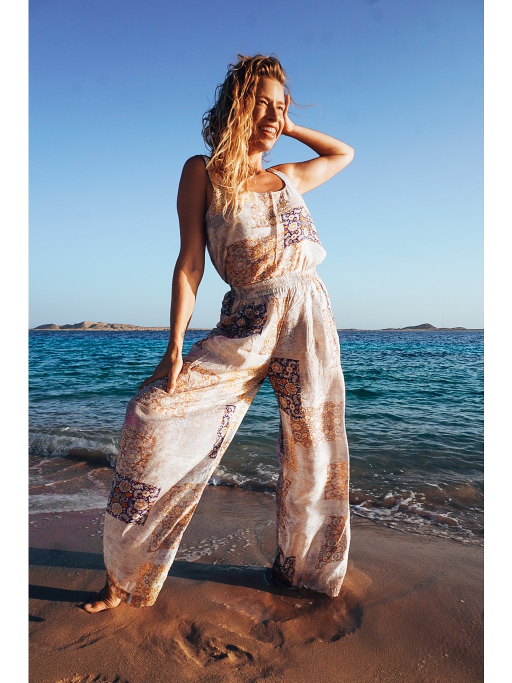 Tyto široké kalhoty z ultra lehkého přírodního materiálu jsou stvořené pro volnost, lehkost a ženský půvab. Splývají s tělem jako dech a s každým krokem se jemně vlní, jako by se jich dotýkal pouštní vánek.