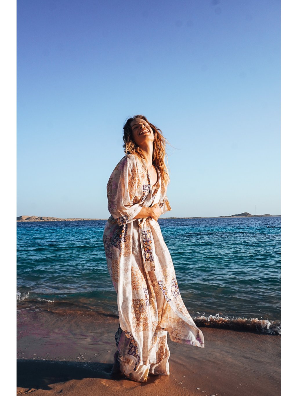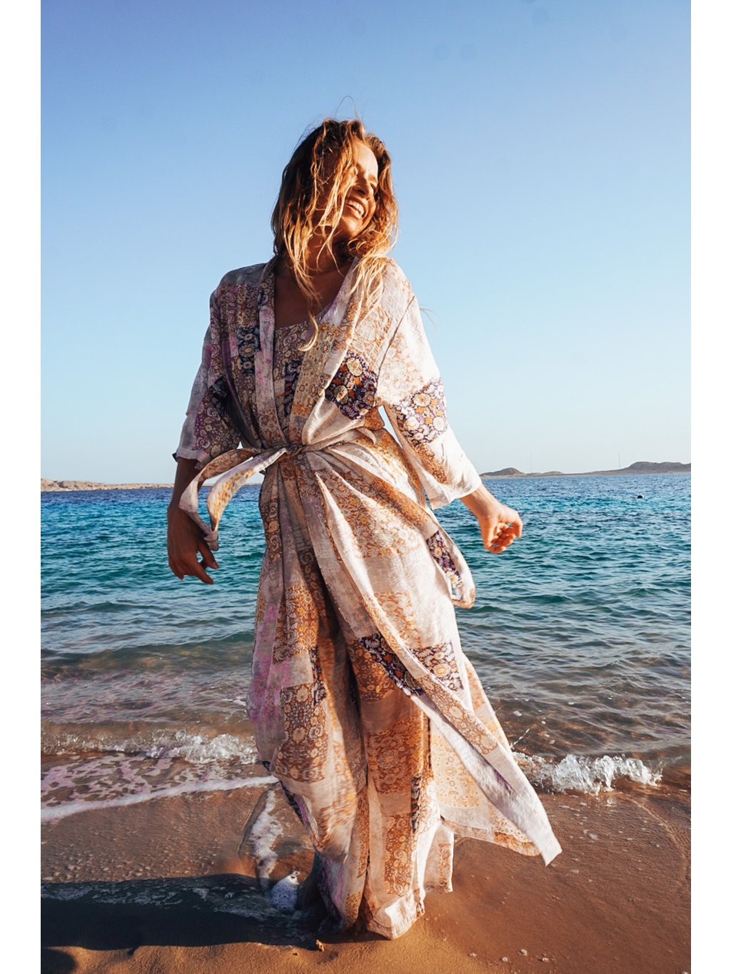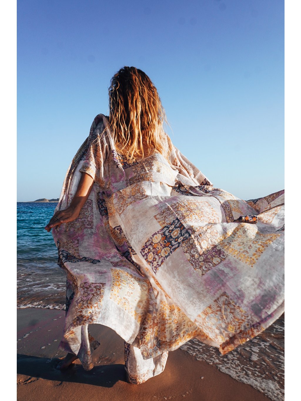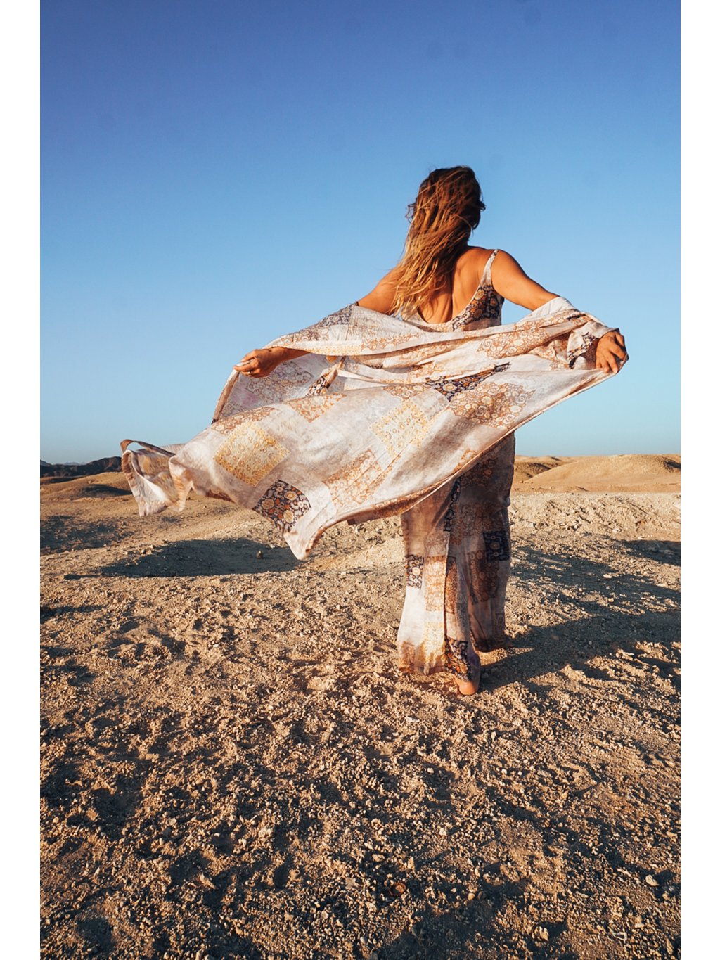 Barevná paleta tohoto kaftanu je jako odraz nebe nad pouští při západu slunce — jemné tóny měsíční modři, zlatavého písku a teplé karamelové hnědi se vzájemně proplétají v dokonalé harmonii.