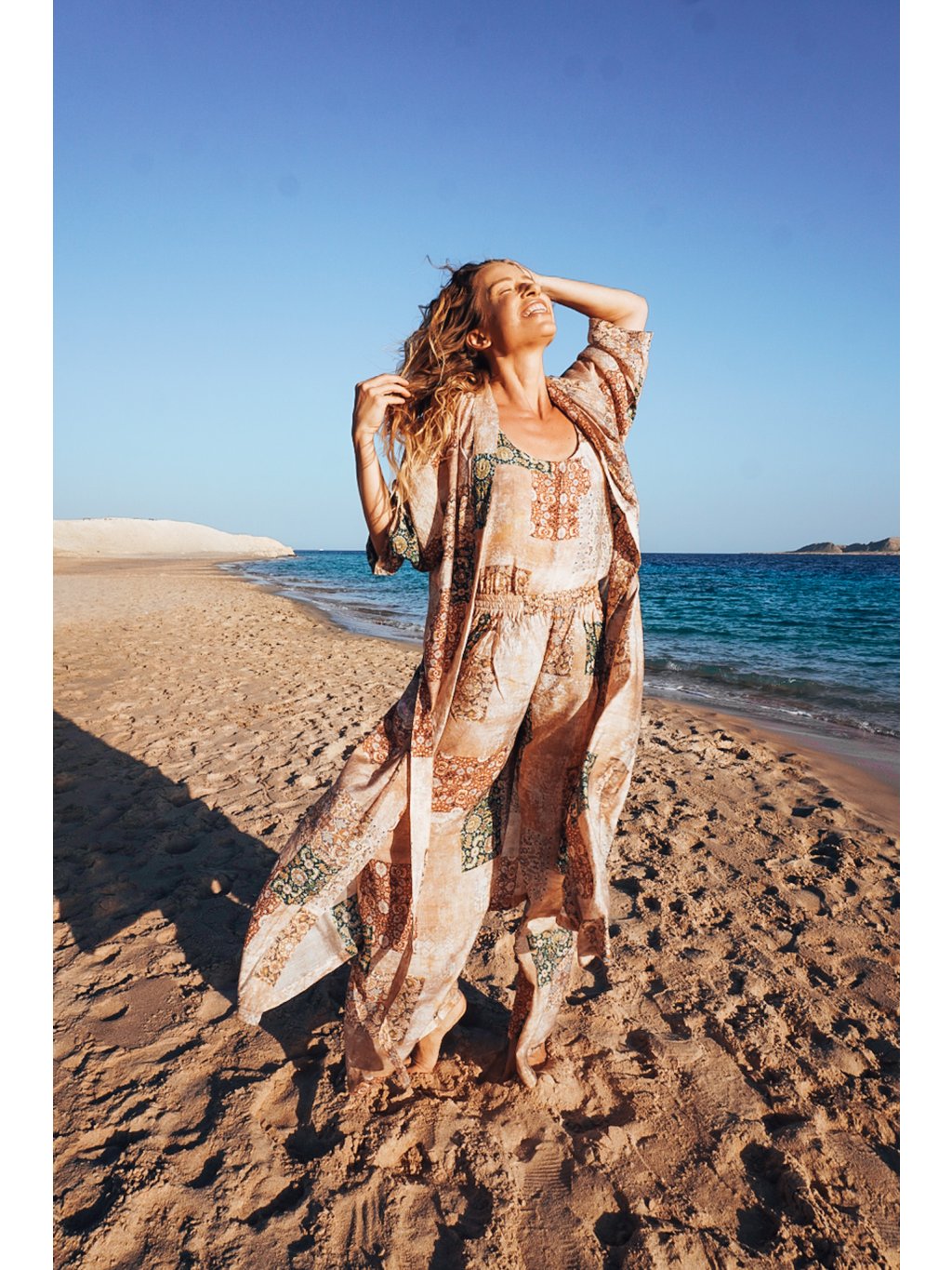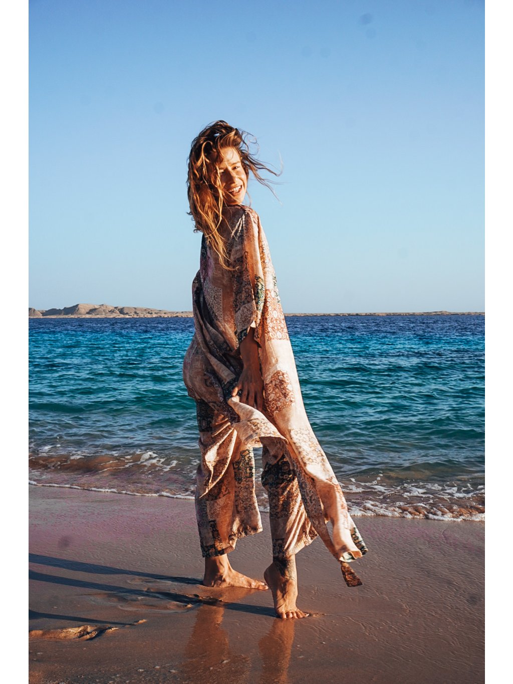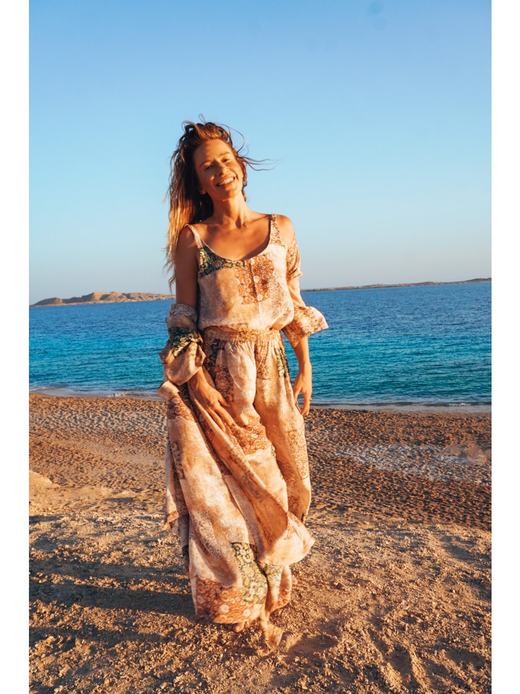 Látka má jemný, saténově matný lesk, který zachycuje světlo s každým pohybem, a působí luxusně i přirozeně zároveň. Celý design nese klid, teplo a ženskou harmonii – jako by ses oblékla do samotného světla západu.