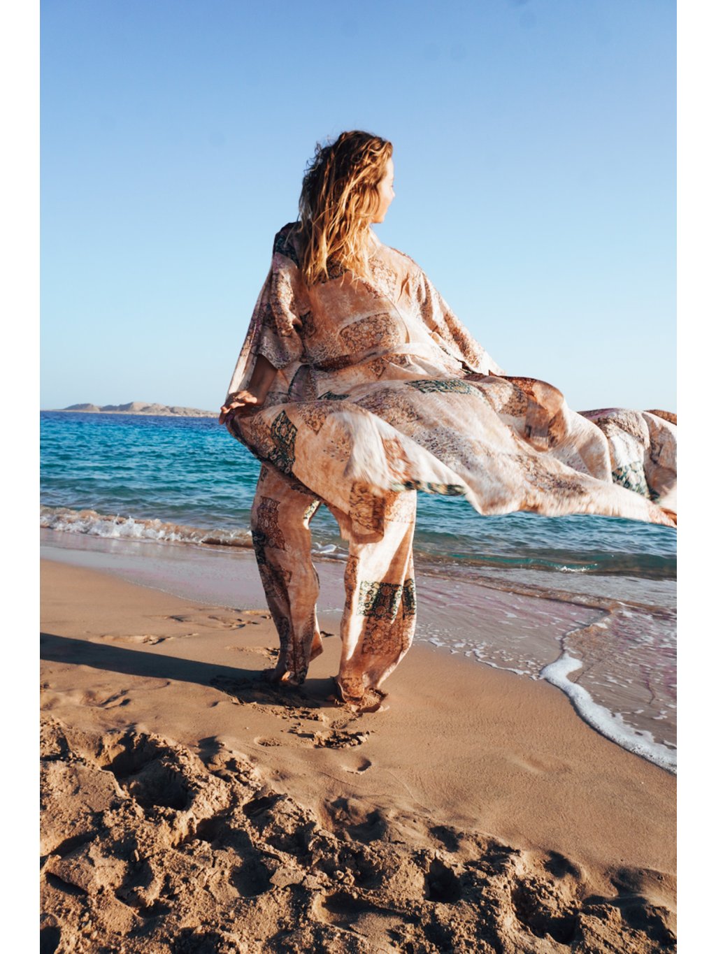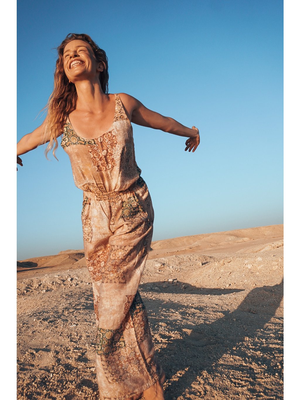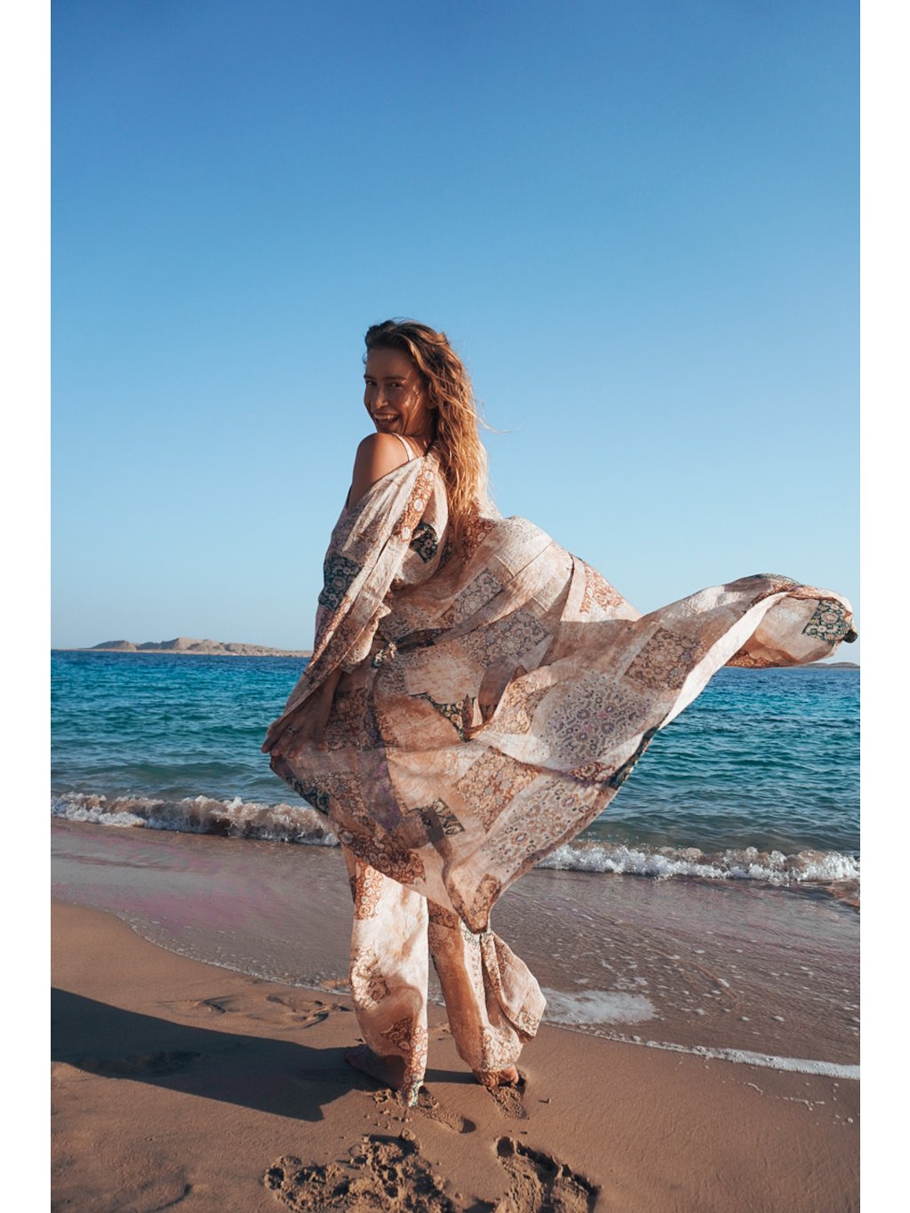 Látka má jemný, saténově matný lesk, který zachycuje světlo s každým pohybem, a působí luxusně i přirozeně zároveň. Celý design nese klid, teplo a ženskou harmonii – jako by ses oblékla do samotného světla západu.