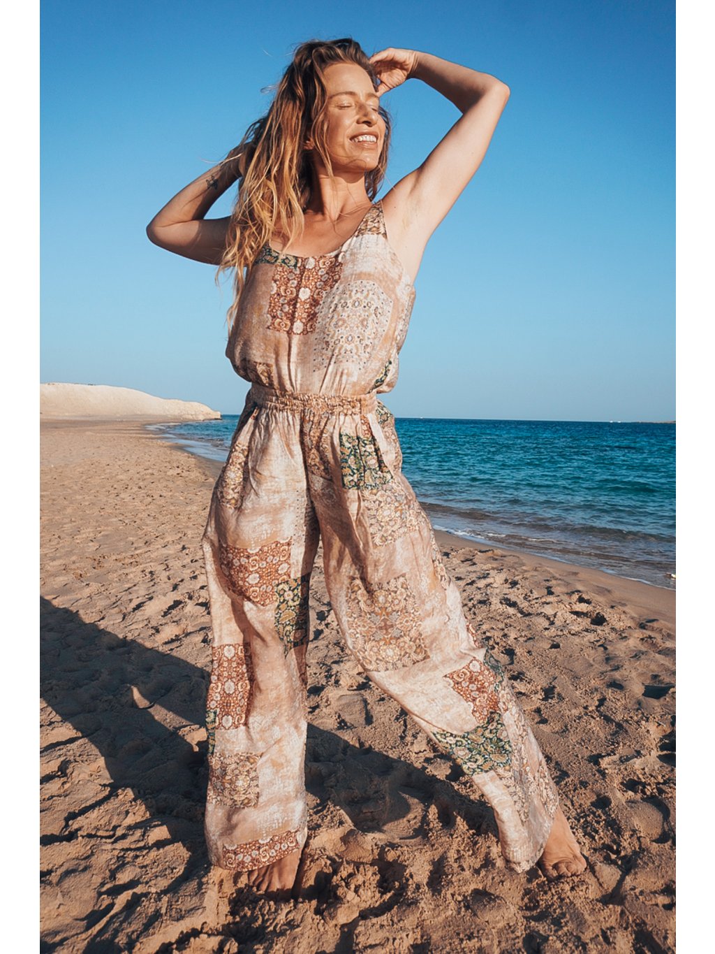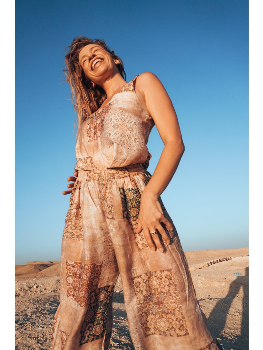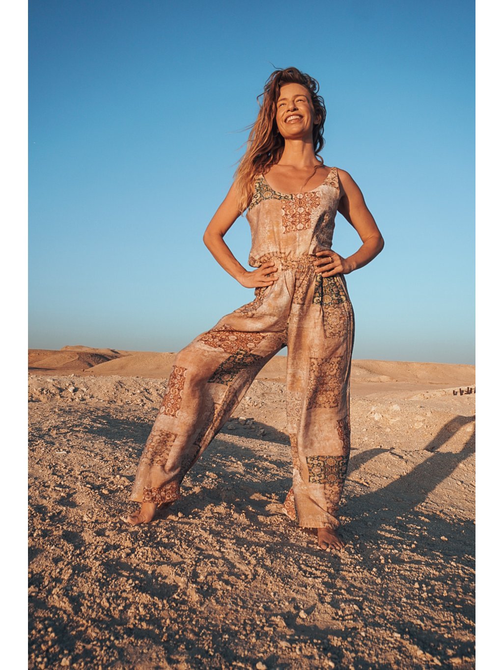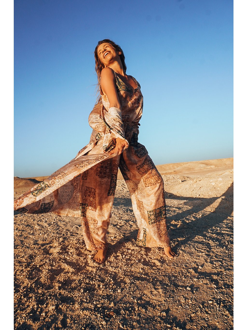 Tyto široké kalhoty z jemného tencelu jsou jako teplý vánek pouště – volné, splývavé a tak pohodlné. Jejich zlatavě medové a olivové tóny ladí s kaftanem Královny Slunce i s Tvou přirozenou září. Látka jemně laská pokožku a objímá tělo v lehkosti a eleganci. Kalhoty, ve kterých se dýchá svoboda a krása každého pohybu.