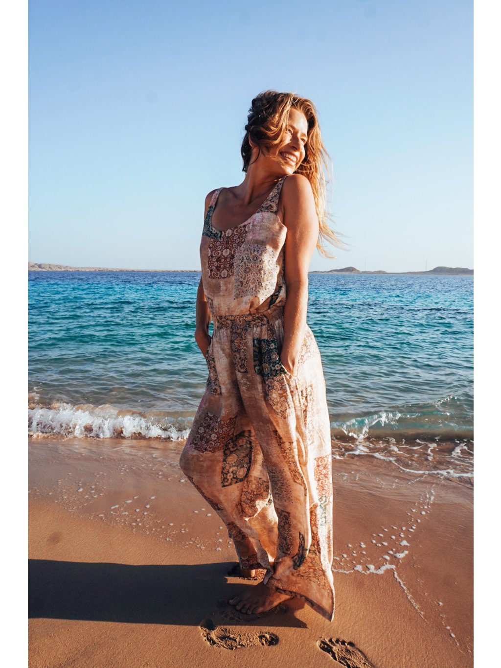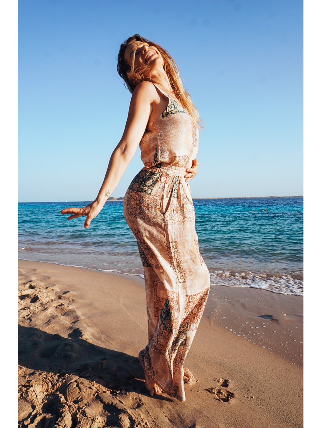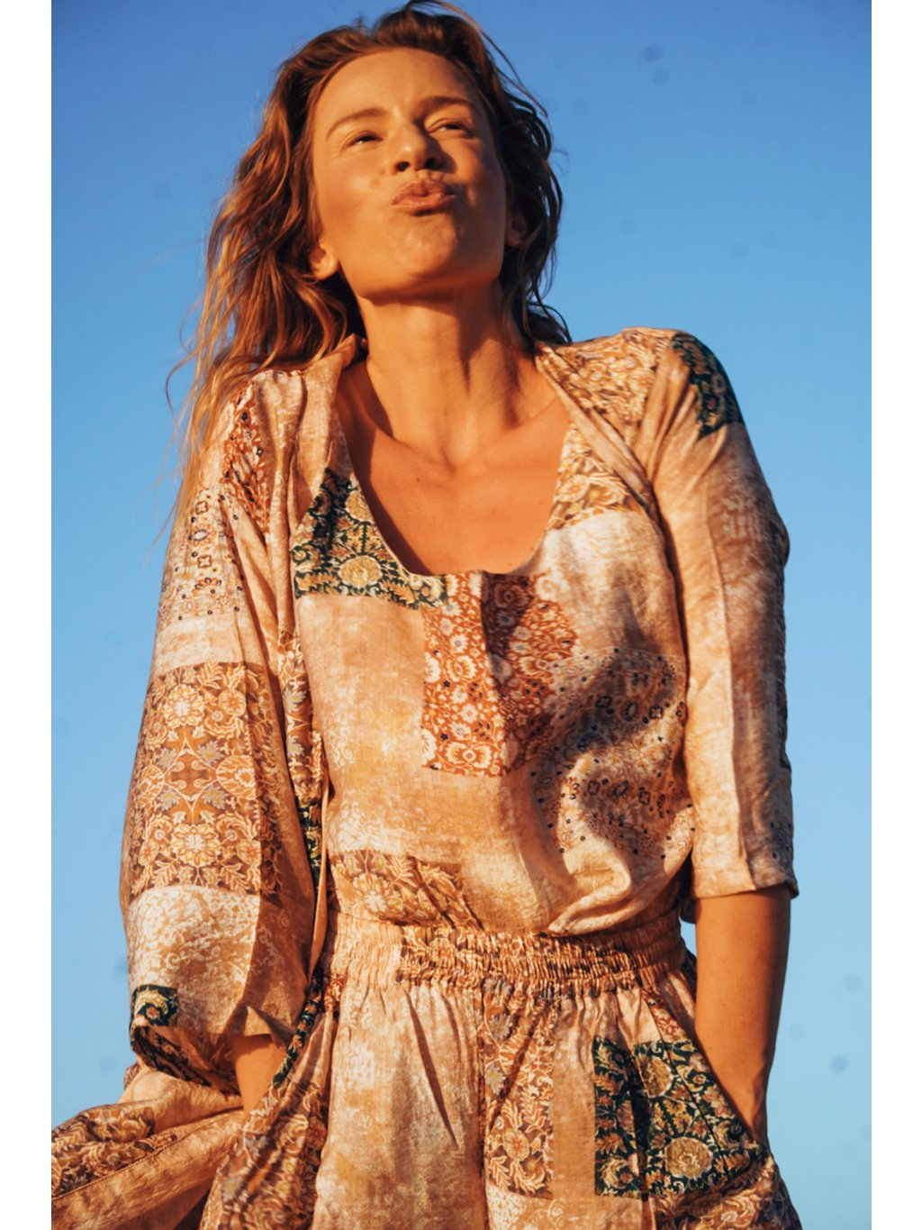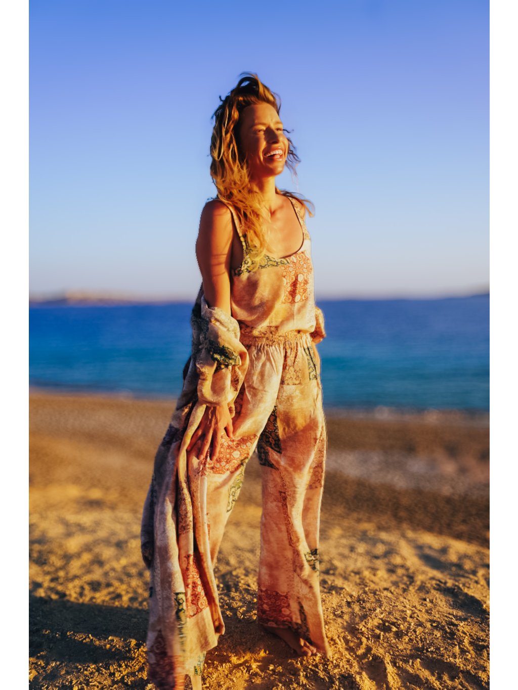 K širokým kalhotám přinášíme top ve stejném designu, ušitý z jemného tencelu (lyocellu), který hladí pokožku jako hedvábný vánek. Střih je dokonale ženský – top se zastrčí do kalhot a společně vytváří efekt postavy přesýpacích hodin, který přirozeně zvýrazní linii pasu a ladnost siluety.