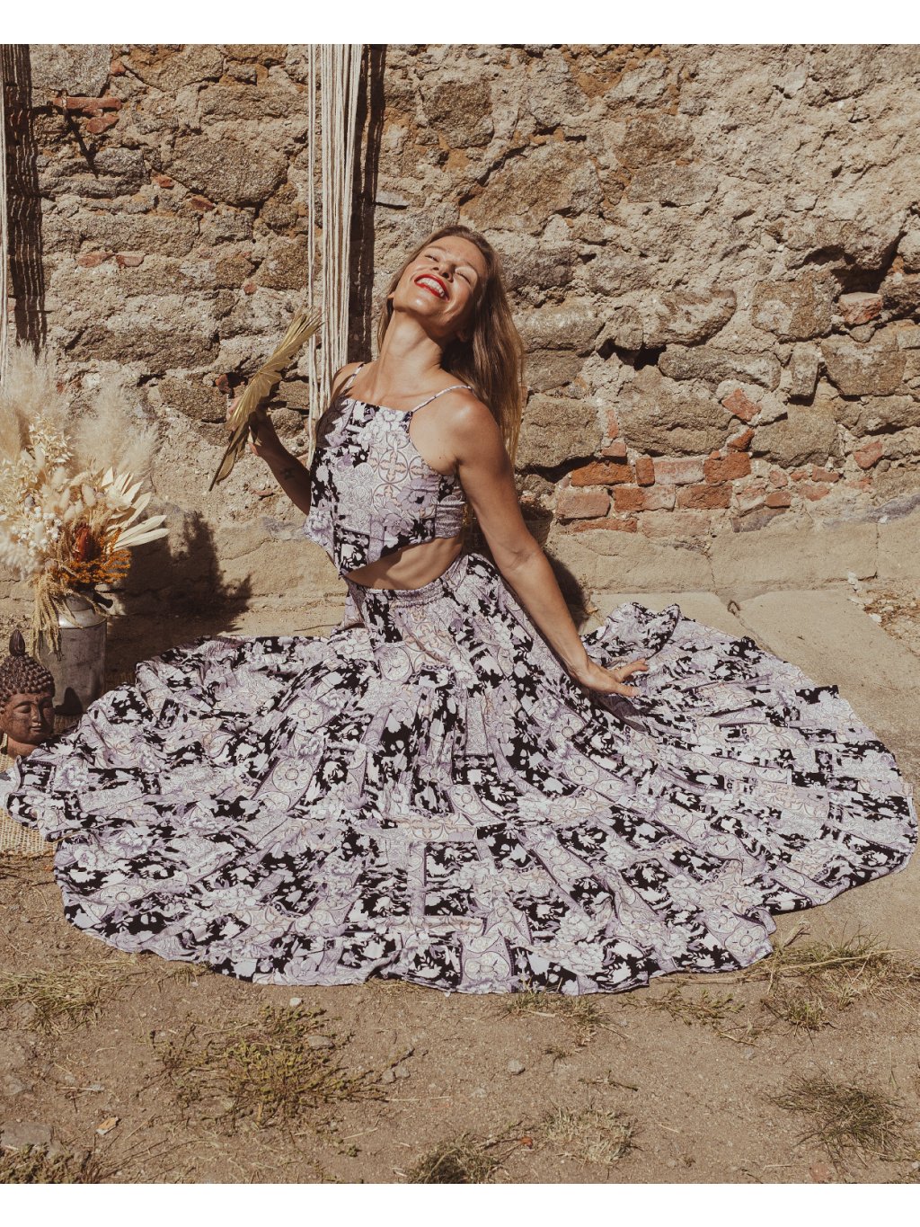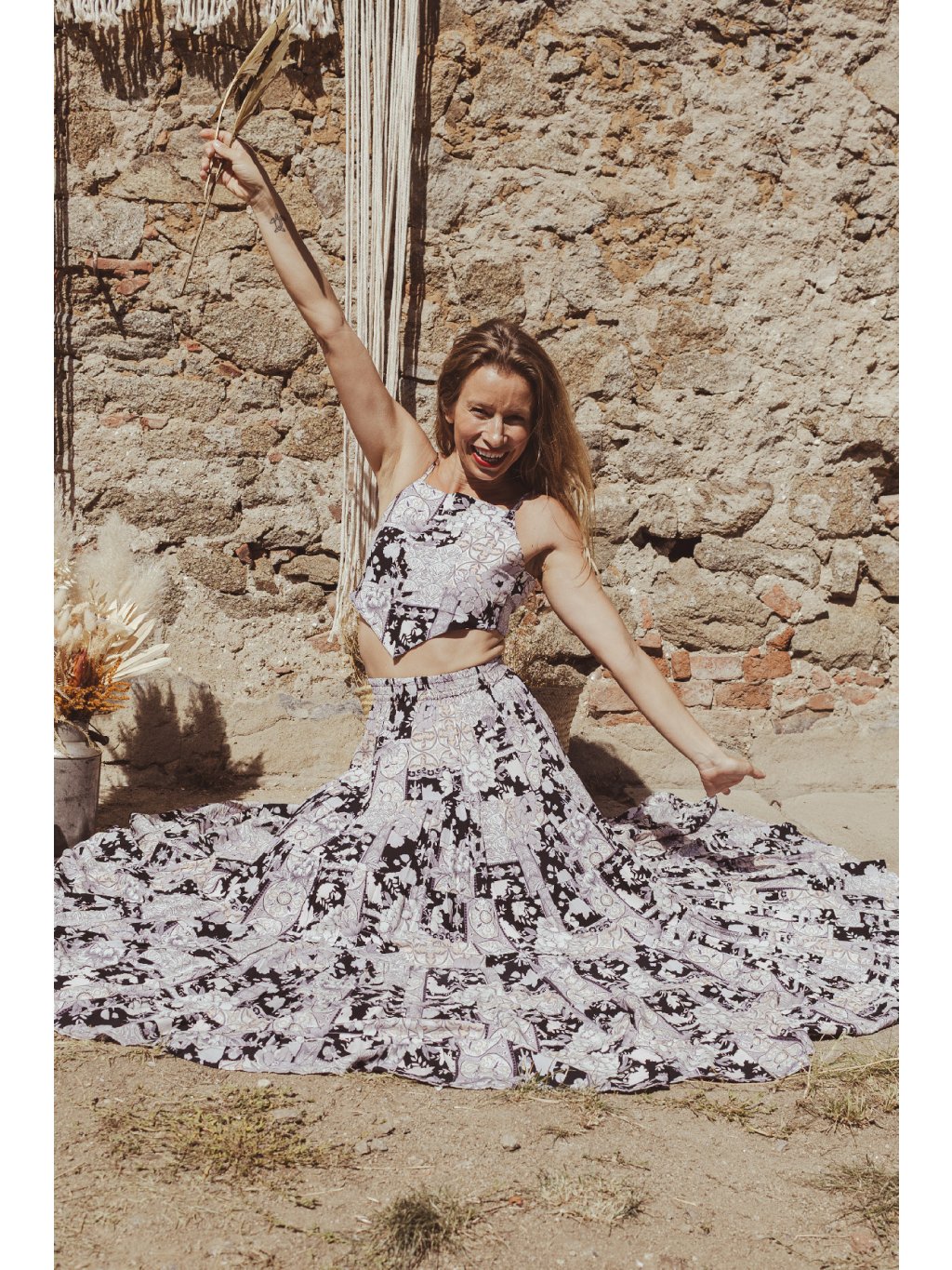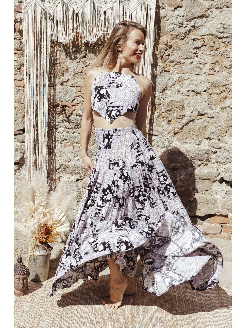 Tříposchoďová kolová sukně s trojúhelníkovým topem. Černo-bílý print se zlatými detaily odráží magii pouštního světla při západu slunce. Byla jsem v něm oděná jako královna připravena na svou iniciaci.
