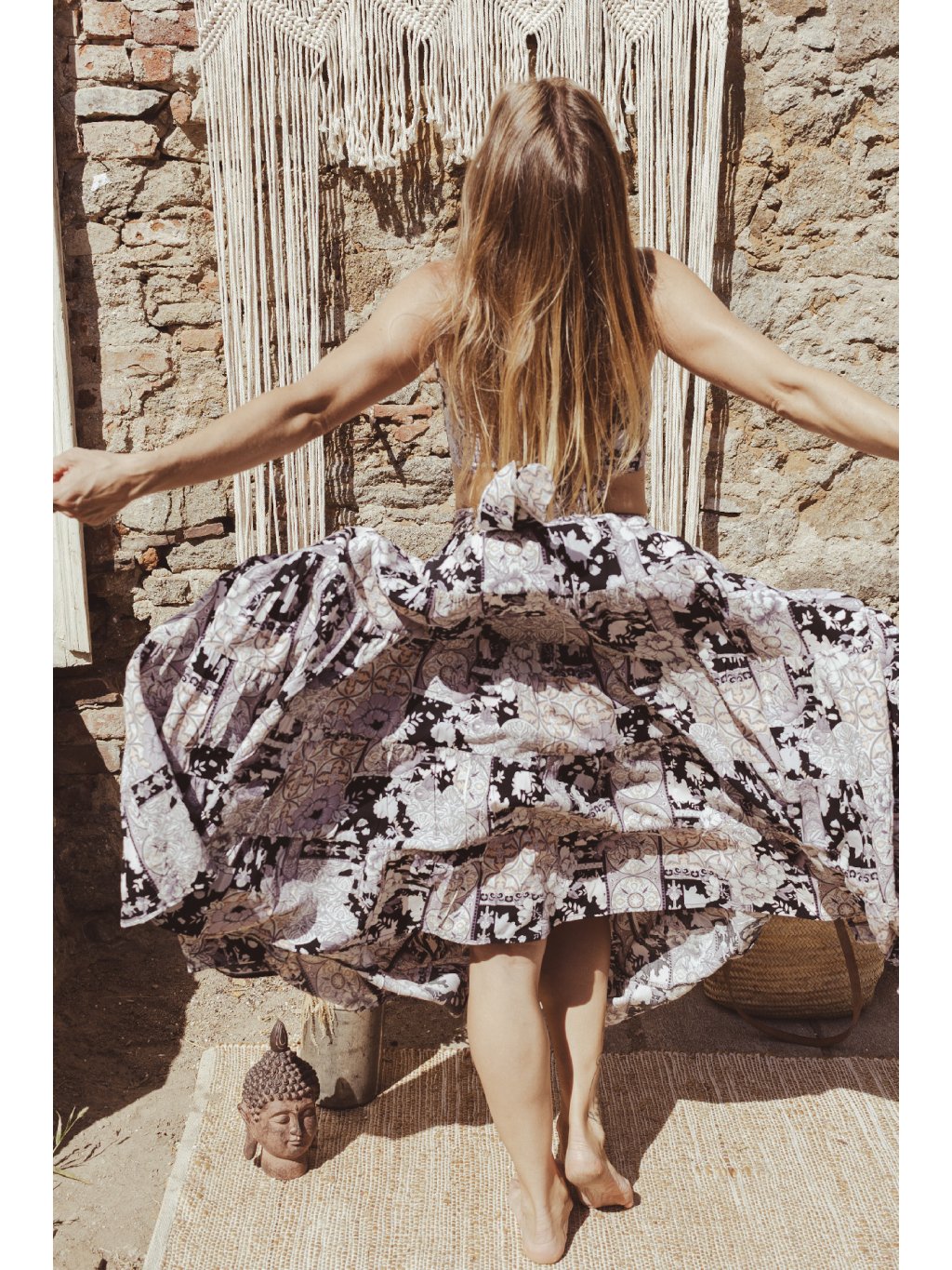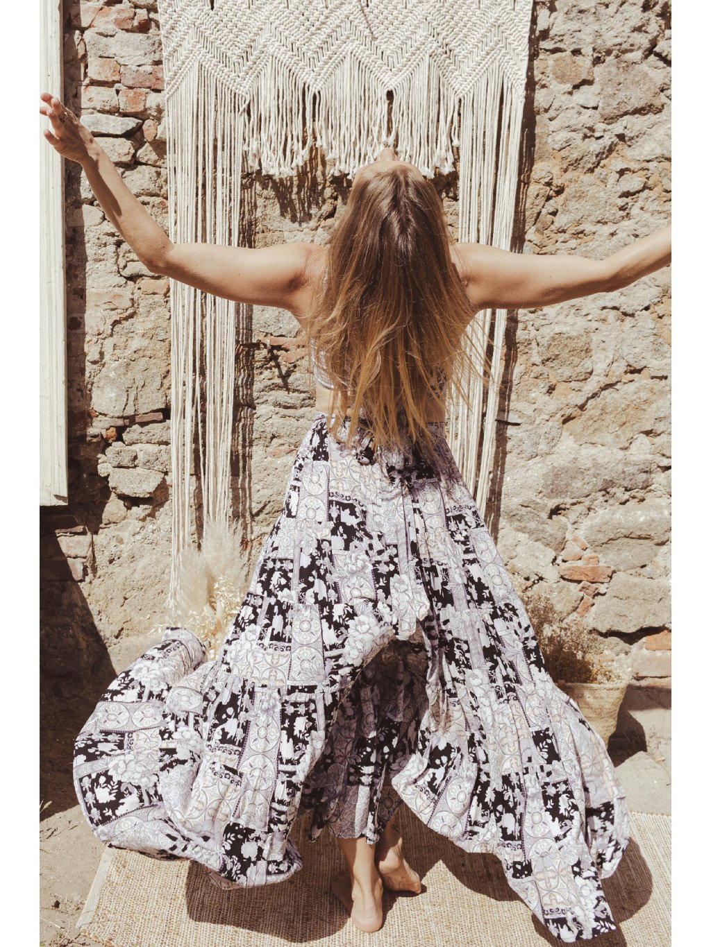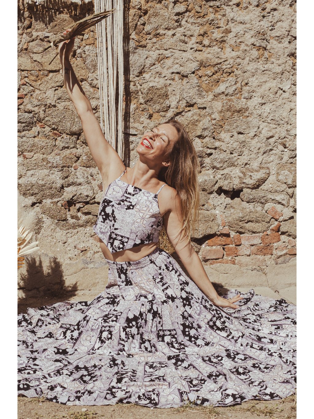 Tříposchoďová kolová sukně s trojúhelníkovým topem. Černo-bílý print se zlatými detaily odráží magii pouštního světla při západu slunce. Byla jsem v něm oděná jako královna připravena na svou iniciaci.