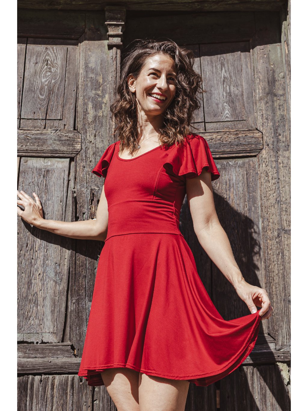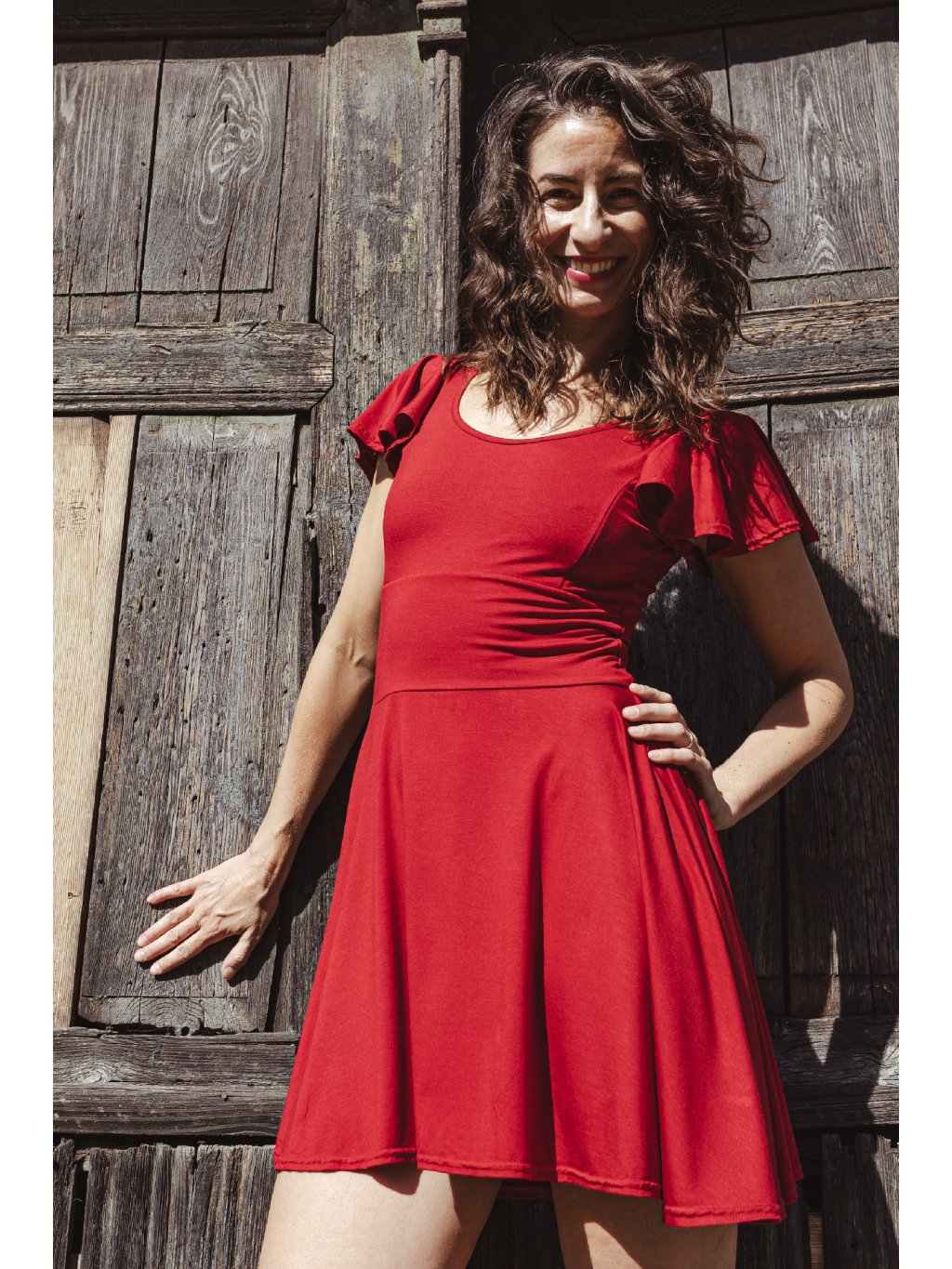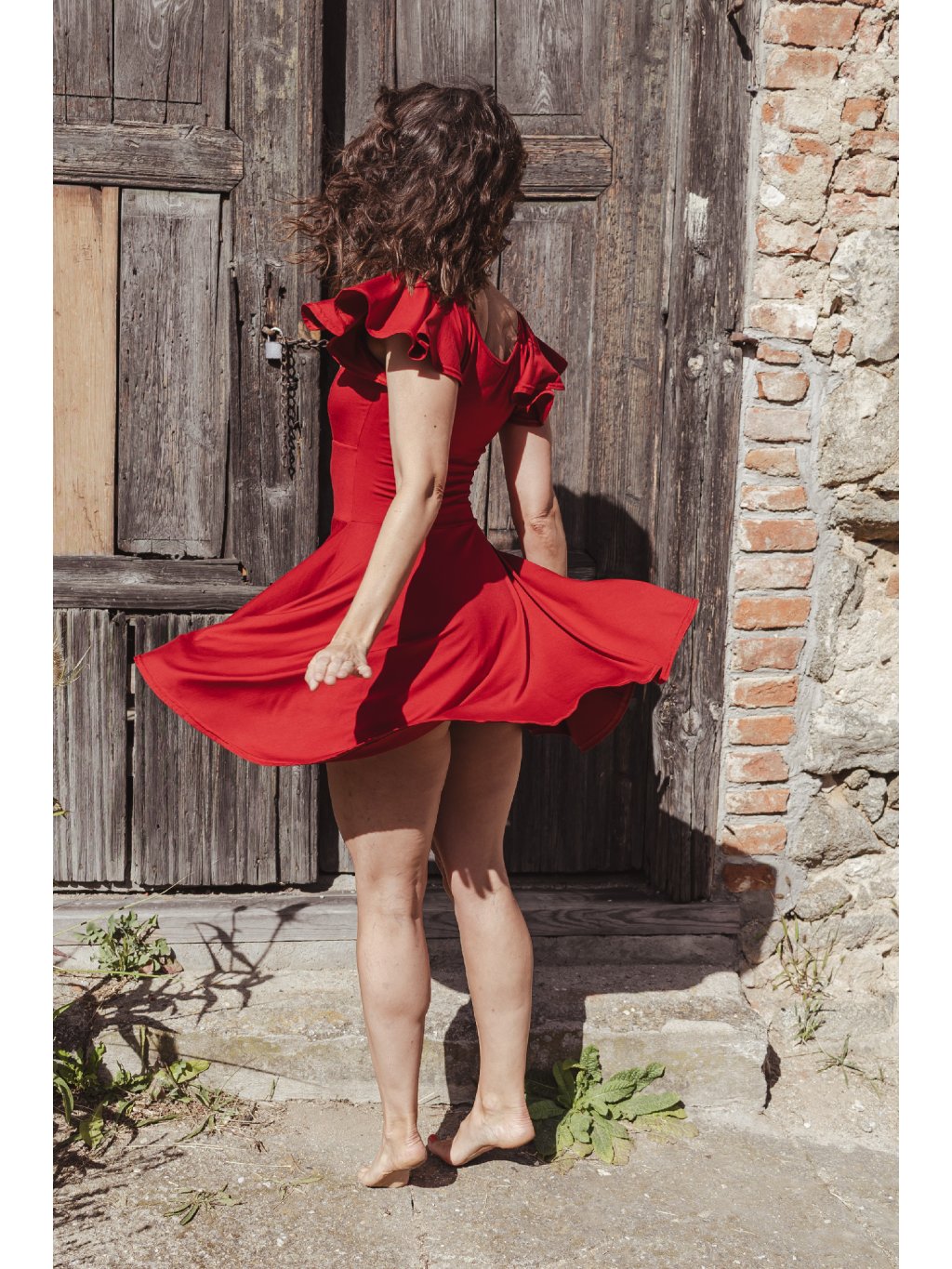 Mistrovský střih s obepnutým živůtkem a rozevlátou kolovou sukní vytváří klasickou přesýpací siluetu, která zdůrazňuje přirozenou krásu ženského těla. Délka těsně nad kolena propůjčuje šatům sofistikovanou hravost, zatímco něžné volánkové rukávky změkčují výraznou barvu a přidávají nádech romantiky.