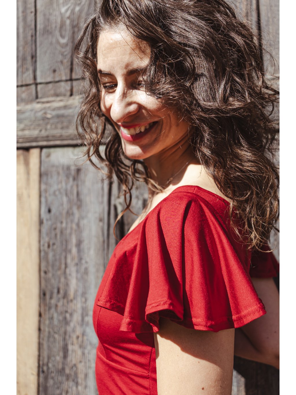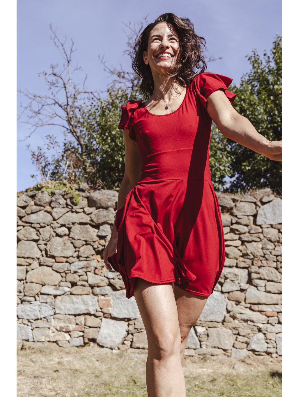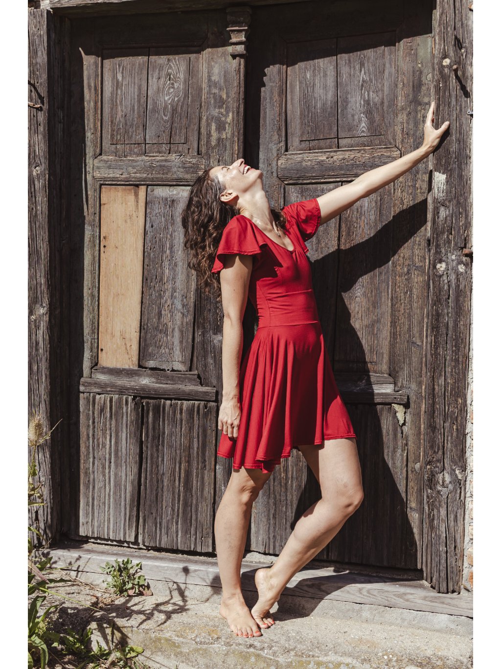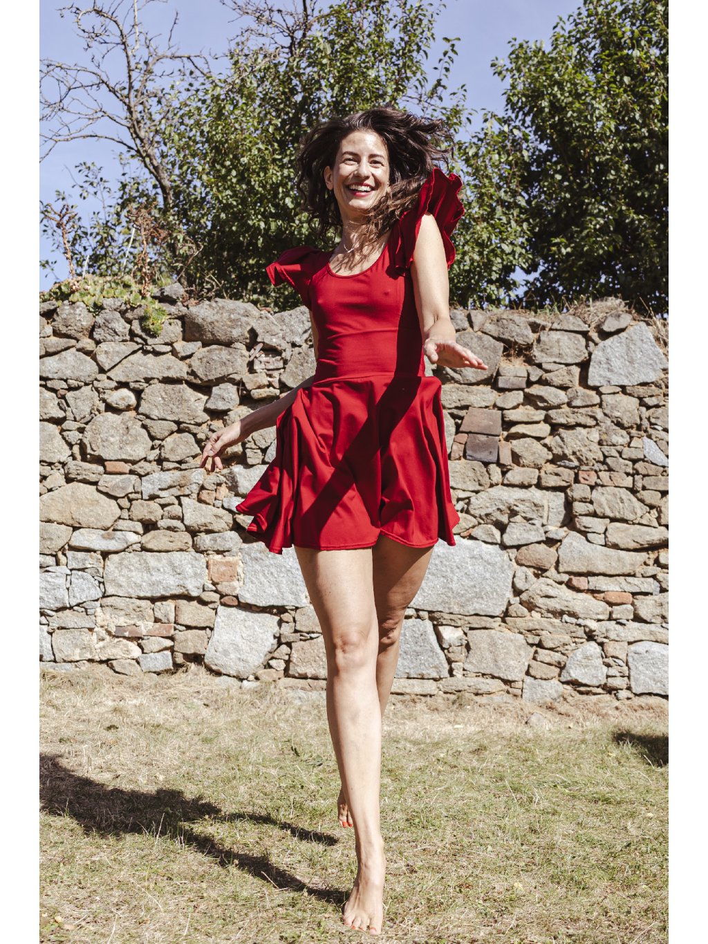 Mistrovský střih s obepnutým živůtkem a rozevlátou kolovou sukní vytváří klasickou přesýpací siluetu, která zdůrazňuje přirozenou krásu ženského těla. Délka těsně nad kolena propůjčuje šatům sofistikovanou hravost, zatímco něžné volánkové rukávky změkčují výraznou barvu a přidávají nádech romantiky.