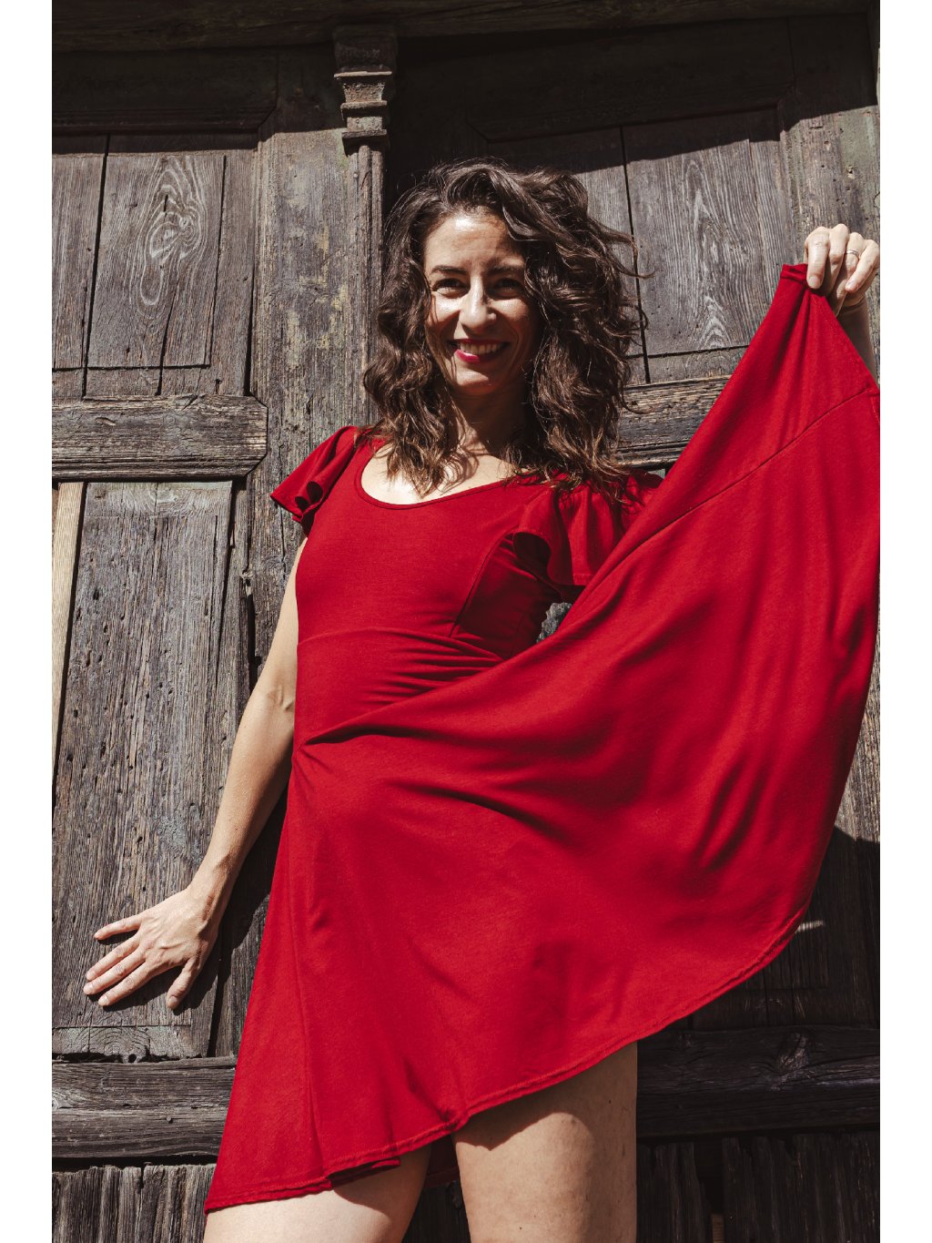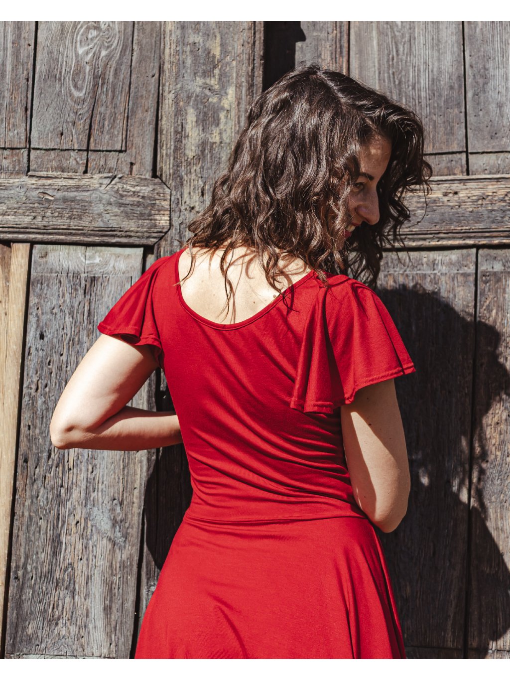 Tyto podmanivé šaty v sytě třešňovém odstínu jsou ztělesněním sebevědomé ženskosti a nadčasové elegance. Ušité z prémiové elastické viskozy, která dokonale objímá křivky Tvého těla a současně poskytuje svobodu pohybu po celý den.