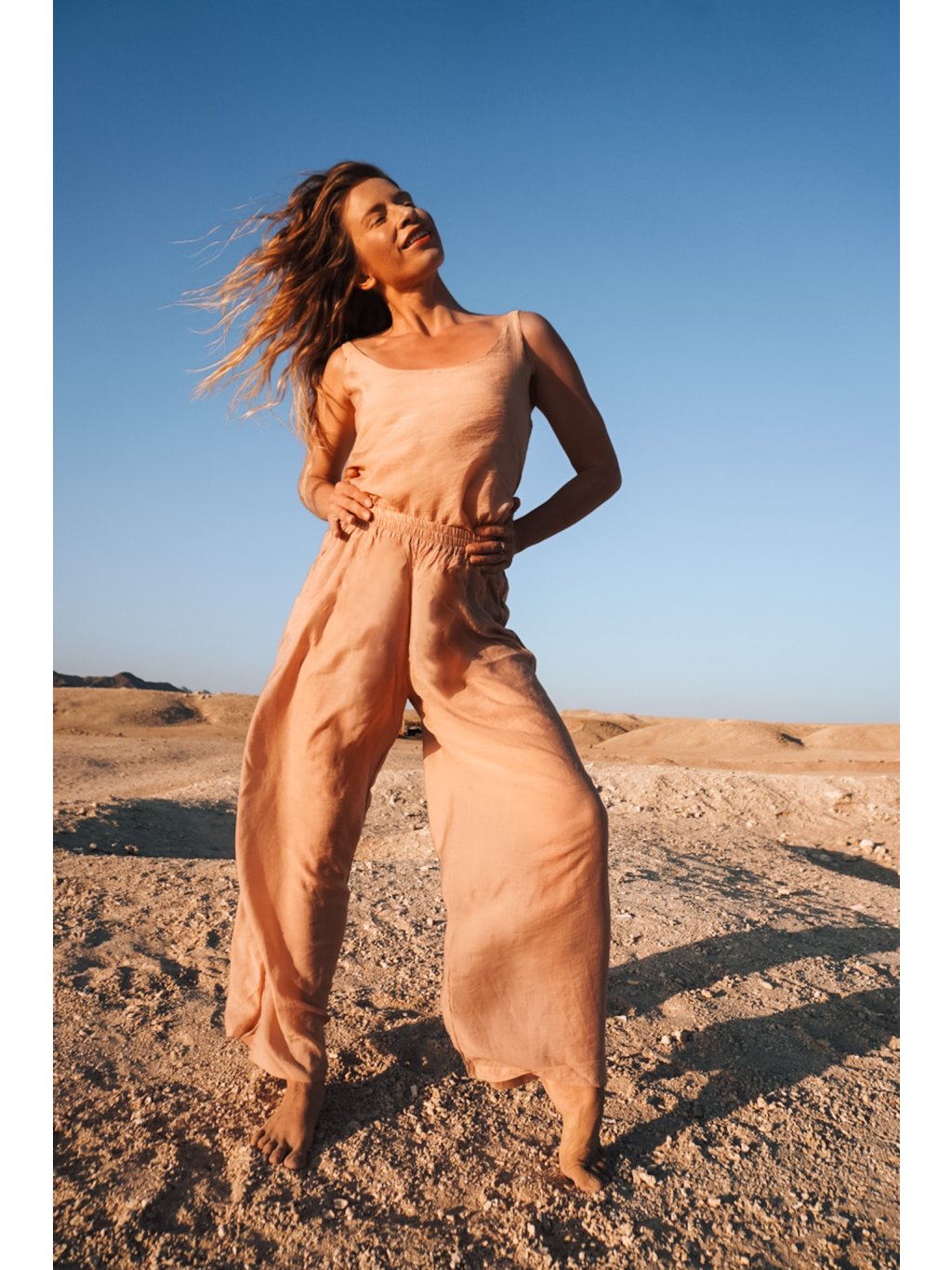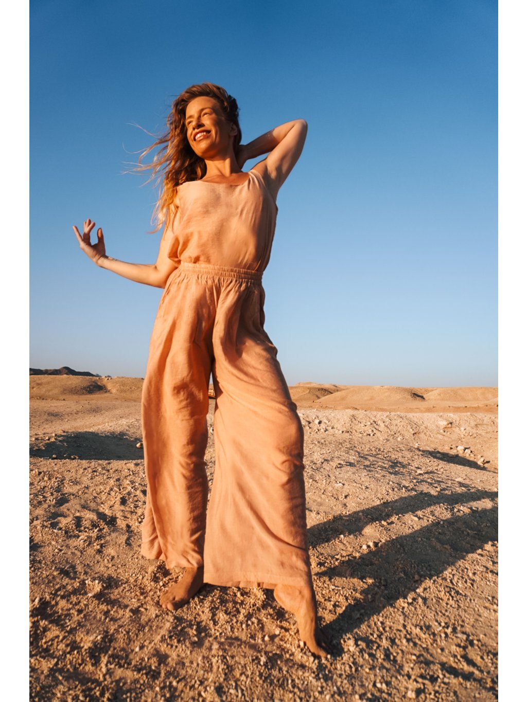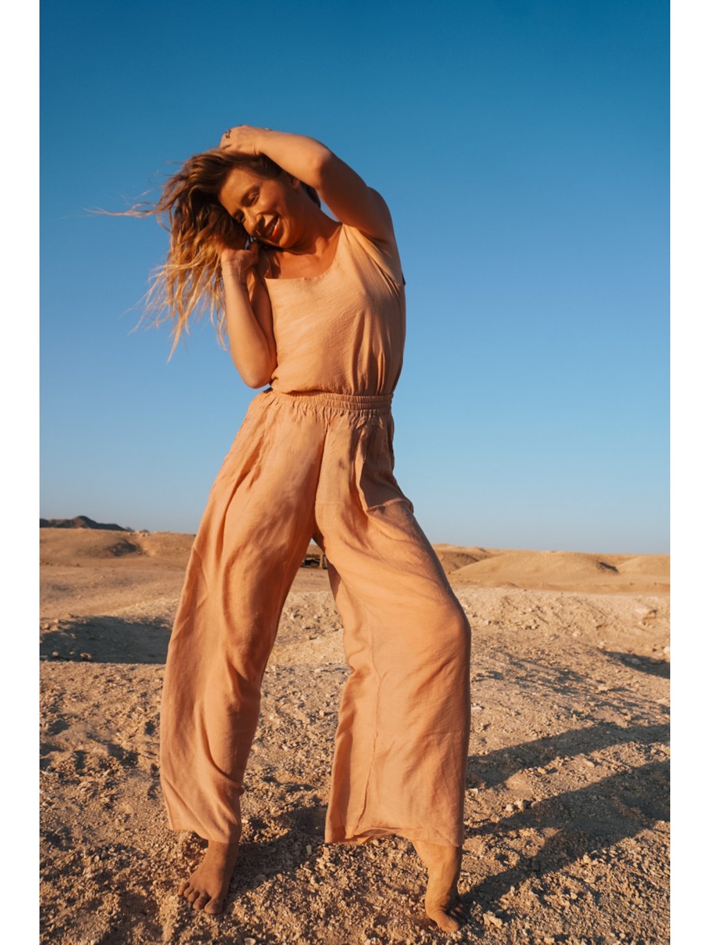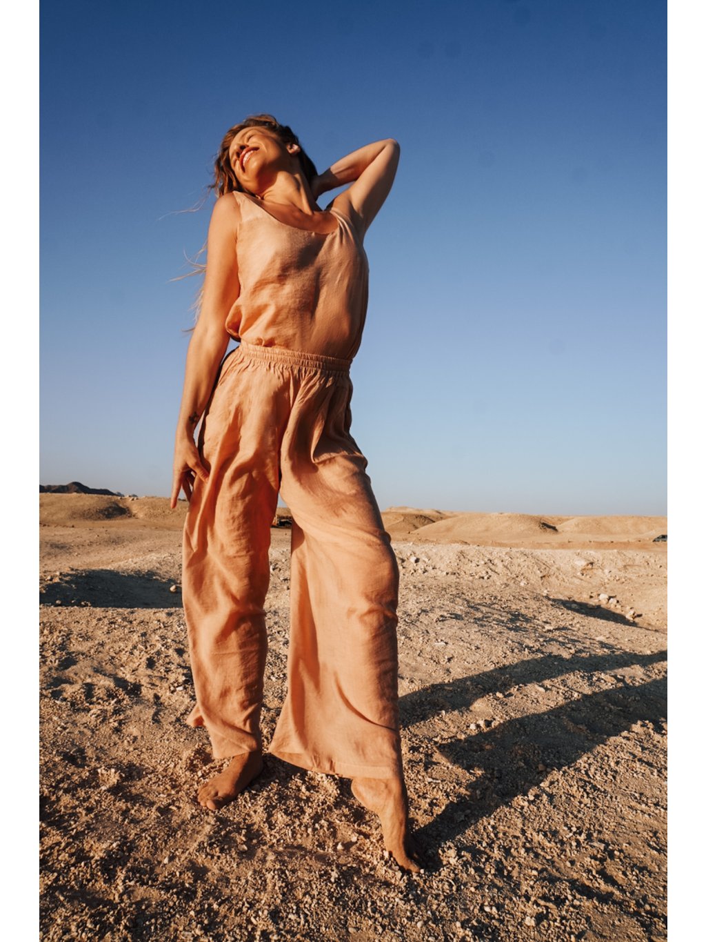 Tyto široké kalhoty z hebkého tencelu (lyocellu) jsou ztělesněním volnosti a ženské elegance. V odstínu zlato-medové záře se lehce pohybují s každým Tvým krokem – jemně splývají, dýchají s Tebou a dávají pocit lehkosti i noblesy zároveň.