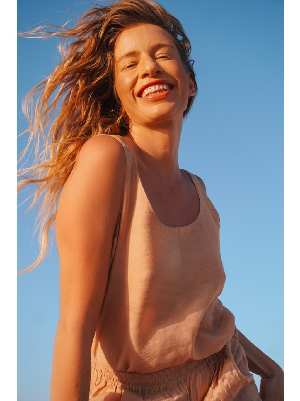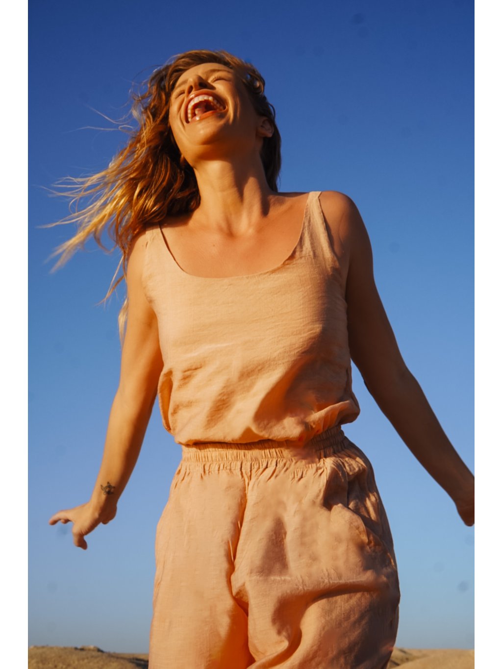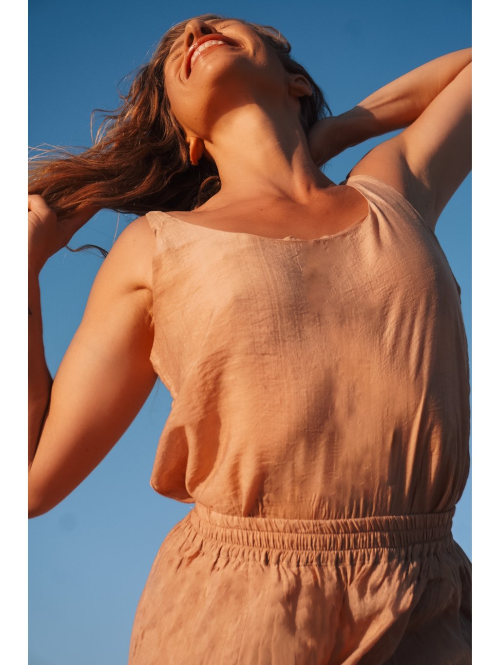 K širokým kalhotám přinášíme top ve stejném zlato-medovém designu, ušitý z jemného tencelu (lyocellu), který hladí pokožku jako hedvábný vánek. Střih je dokonale ženský – top se zastrčí do kalhot a společně vytváří efekt postavy přesýpacích hodin, který přirozeně zvýrazní linii pasu a ladnost siluety.