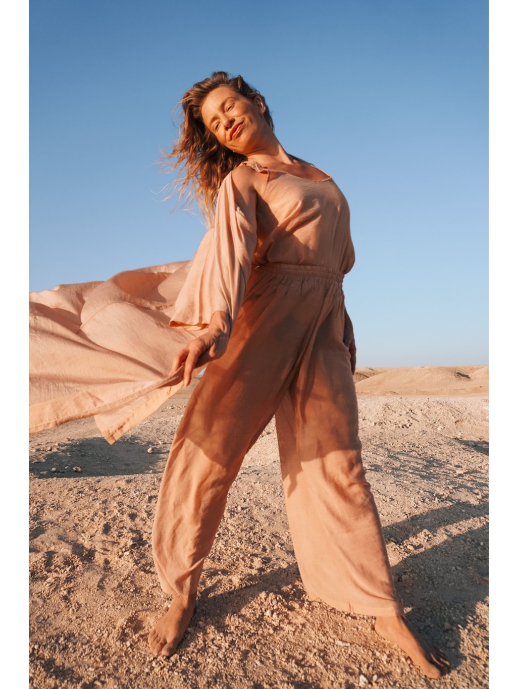 Vklouzni do hebkosti, která se pohybuje s Tebou. Tyto široké kalhoty ze zlato-medového tencelu jsou jako dotek teplého větru – jemné, splývavé a přirozeně elegantní. Látka laská pokožku a zároveň září v teplém odstínu, který lichotí každému tónu pleti. Kalhoty, ve kterých se cítíš volně, smyslně a krásně sama sebou.
