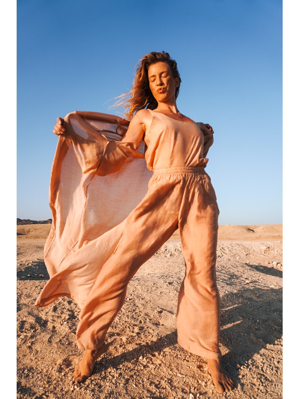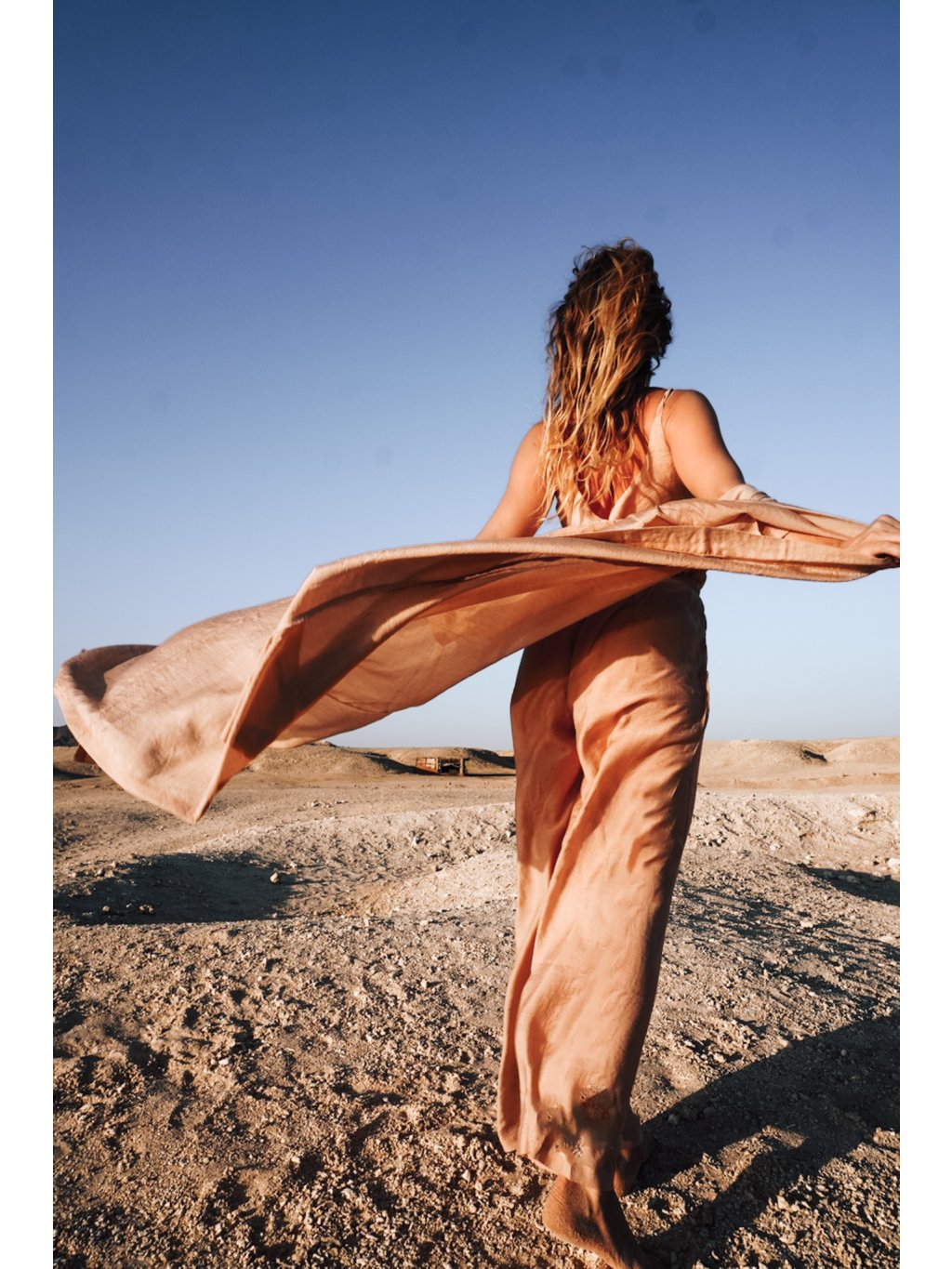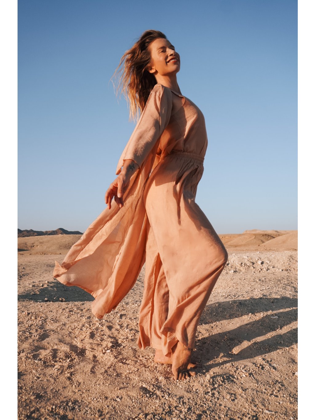 Tento kaftan z jemného tencelu (lyocellu) je jako pohlazení večerního slunce – celý v odstínu zlatavé hnědi, bez jediného vzoru, čistý a zářivý svou jednoduchostí.